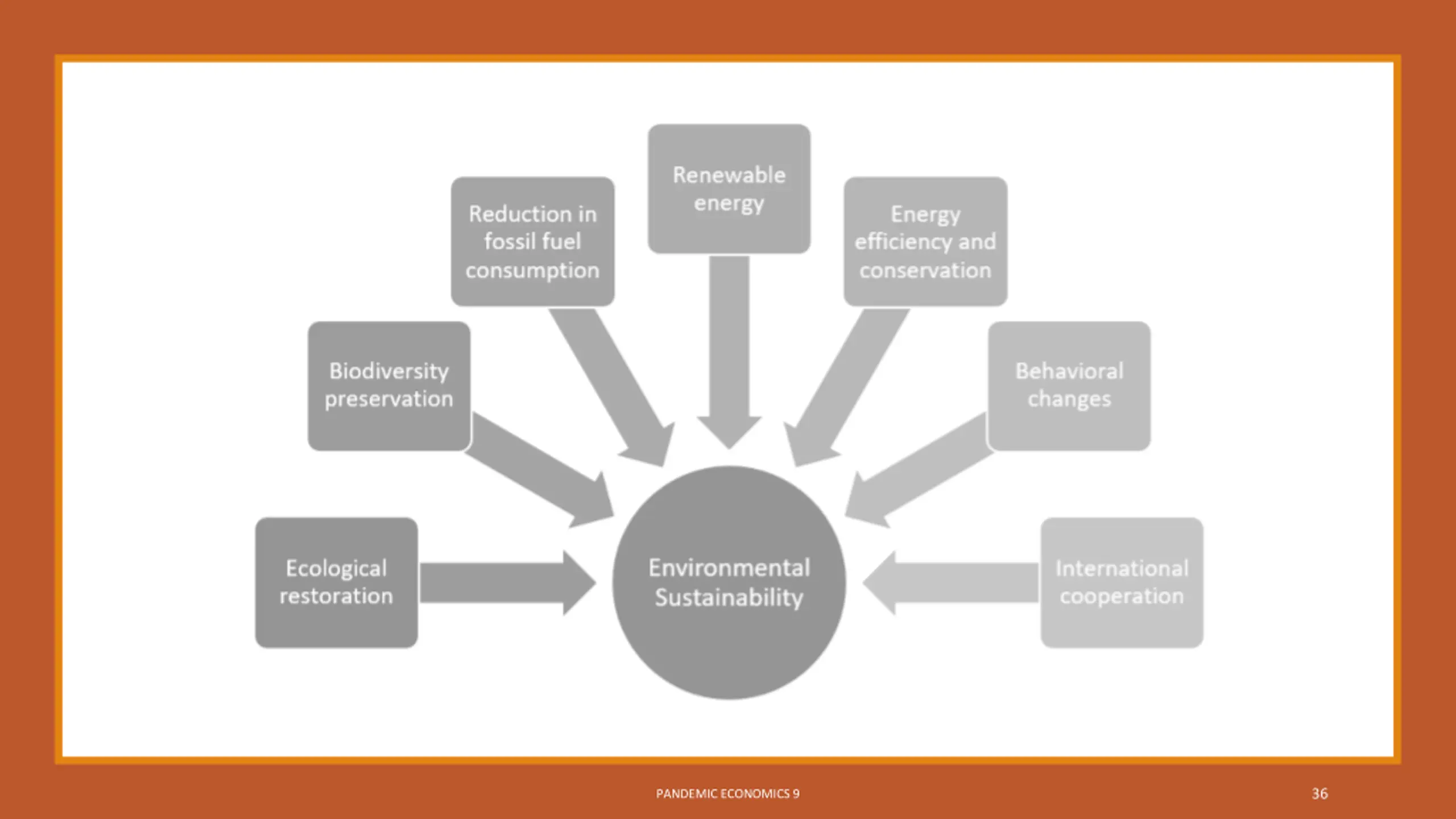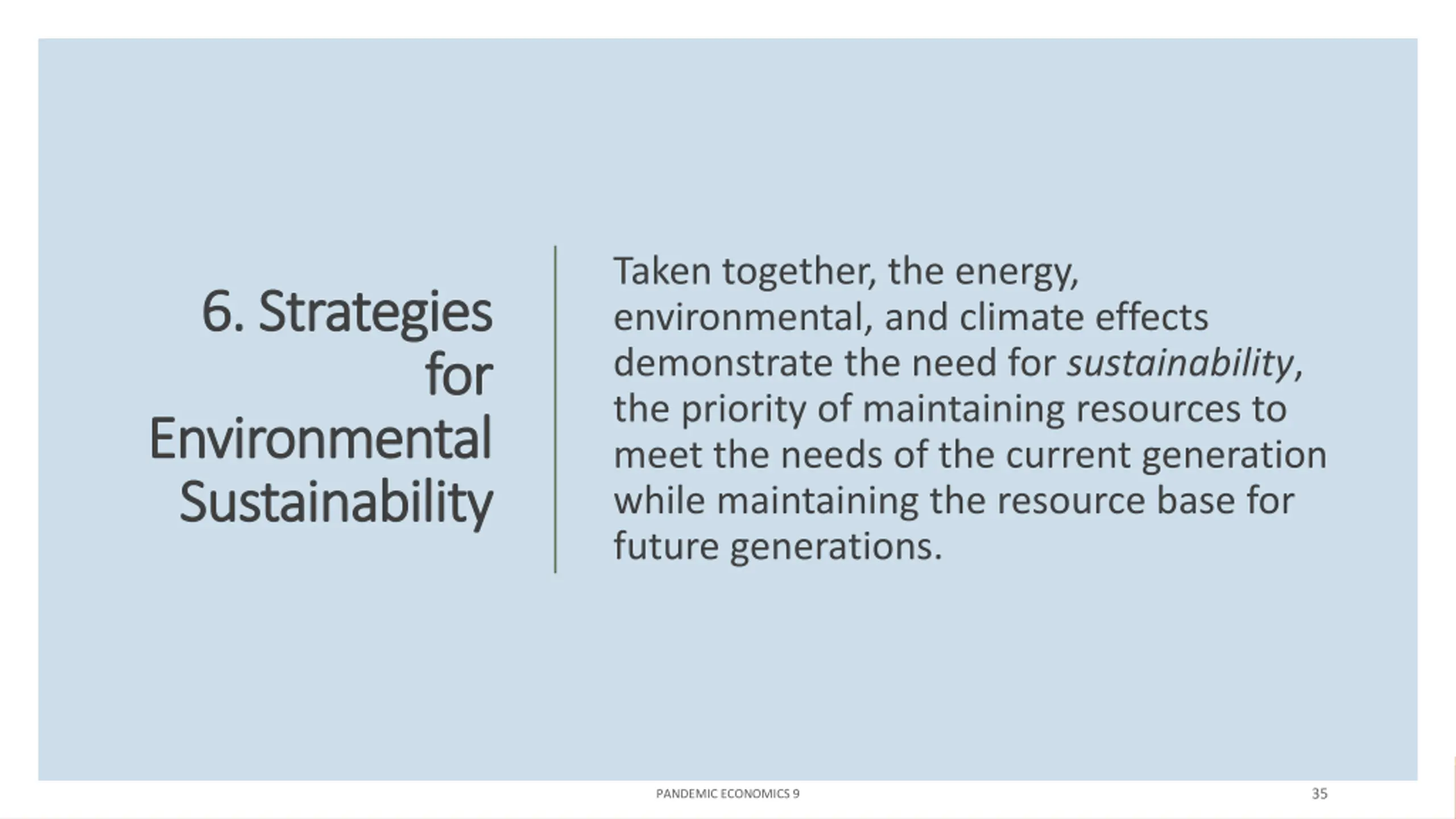 Taken together, the energy, environmental, and climate effects demonstrate the need for sustainability, the priority of maintaining resources to meet the needs of the current generation while maintaining the resource base for future generations. 6. Strategies 6. Strategies for for Environmental Environmental Sustainability Sustainability 35 PANDEMIC ECONOMICS 9