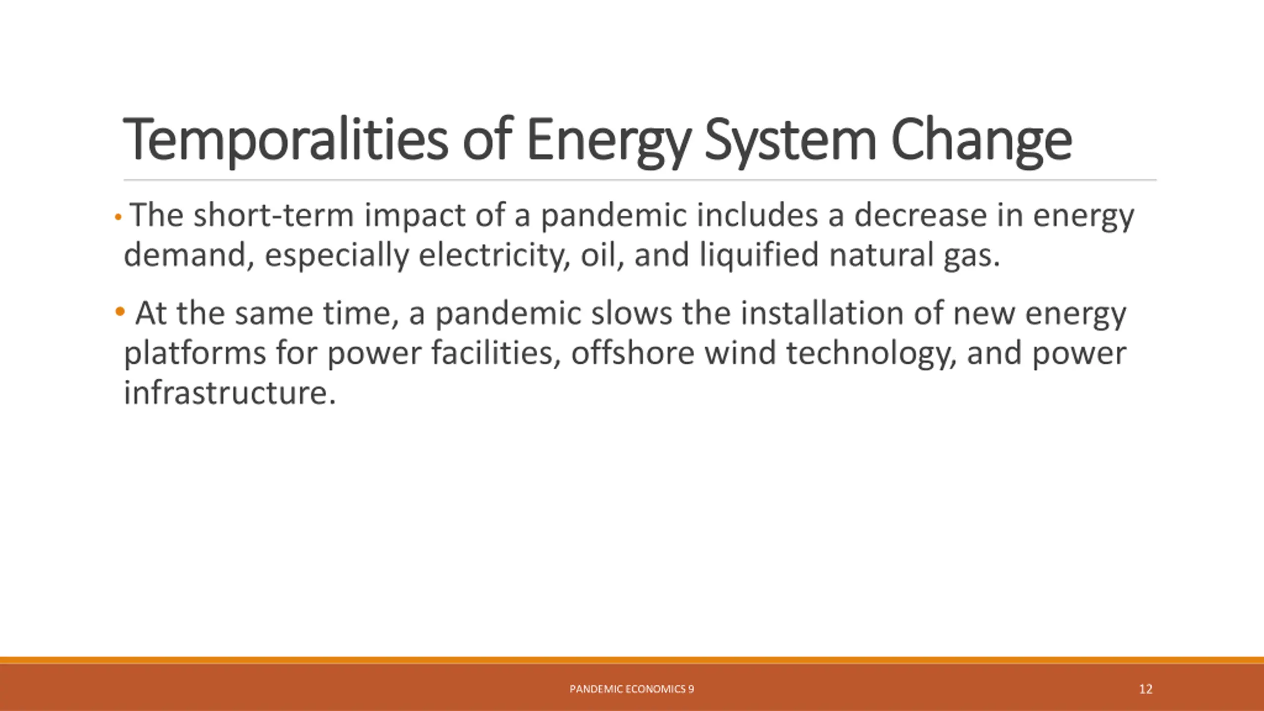 Temporalities of Energy System Change Temporalities of Energy System Change The short-term impact of a pandemic includes a decrease in energy demand, especially electricity, oil, and liquified natural gas. At the same time, a pandemic slows the installation of new energy platforms for power facilities, offshore wind technology, and power infrastructure. 12 PANDEMIC ECONOMICS 9