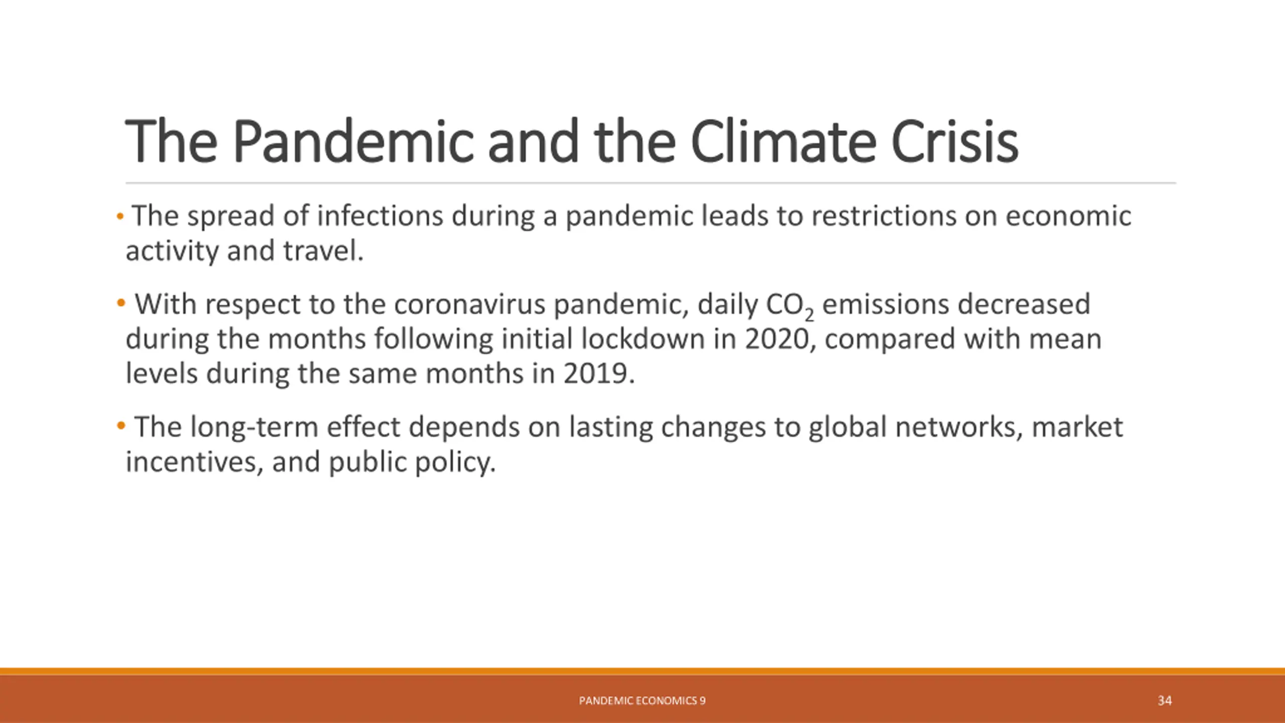 The Pandemic and the Climate Crisis The Pandemic and the Climate Crisis The spread of infections during a pandemic leads to restrictions on economic activity and travel. With respect to the coronavirus pandemic, daily CO2 emissions decreased during the months following initial lockdown in 2020, compared with mean levels during the same months in 2019. The long-term effect depends on lasting changes to global networks, market incentives, and public policy. 34 PANDEMIC ECONOMICS 9