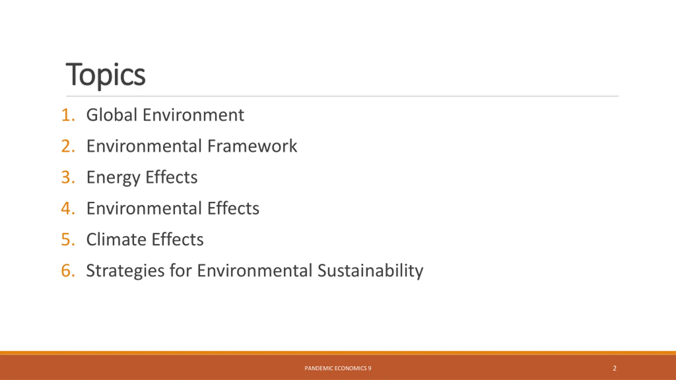 Topics Topics 1. Global Environment 2. Environmental Framework 3. Energy Effects 4. Environmental Effects 5. Climate Effects 6. Strategies for Environmental Sustainability 2 PANDEMIC ECONOMICS 9