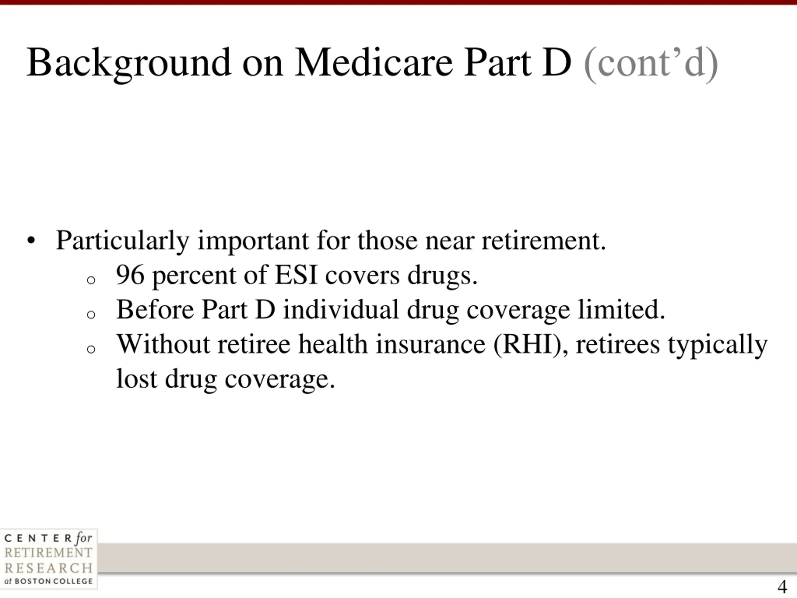 Background on Medicare Part D (contd) Particularly important for those near retirement. o 96 percent of ESI covers drugs. o Before Part D individual drug coverage limited. o Without retiree health insurance (RHI), retirees typically lost drug coverage. 4 4
