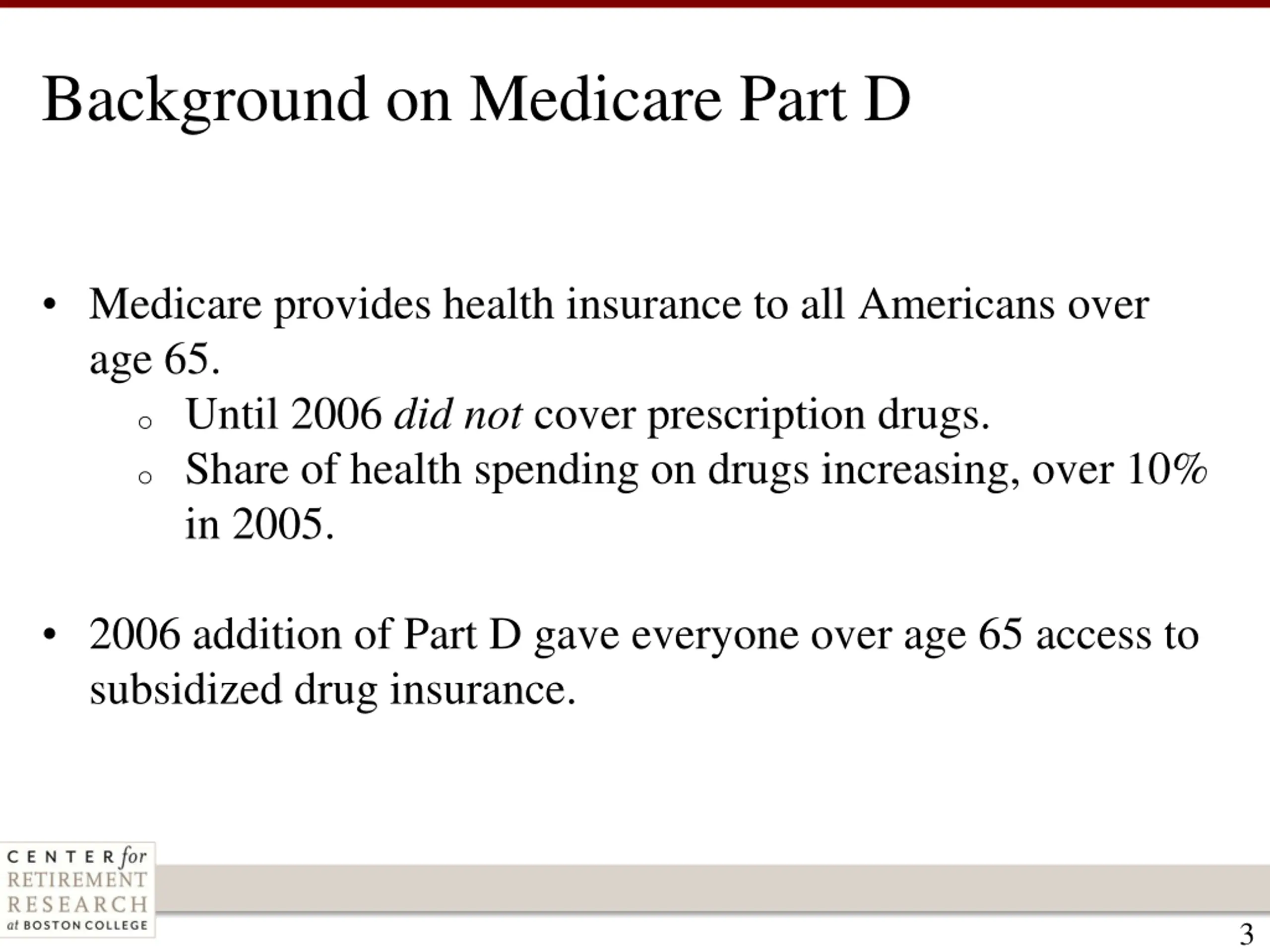 Background on Medicare Part D Medicare provides health insurance to all Americans over age 65. o Until 2006 did not cover prescription drugs. o Share of health spending on drugs increasing, over 10% in 2005. 2006 addition of Part D gave everyone over age 65 access to subsidized drug insurance. 3 3