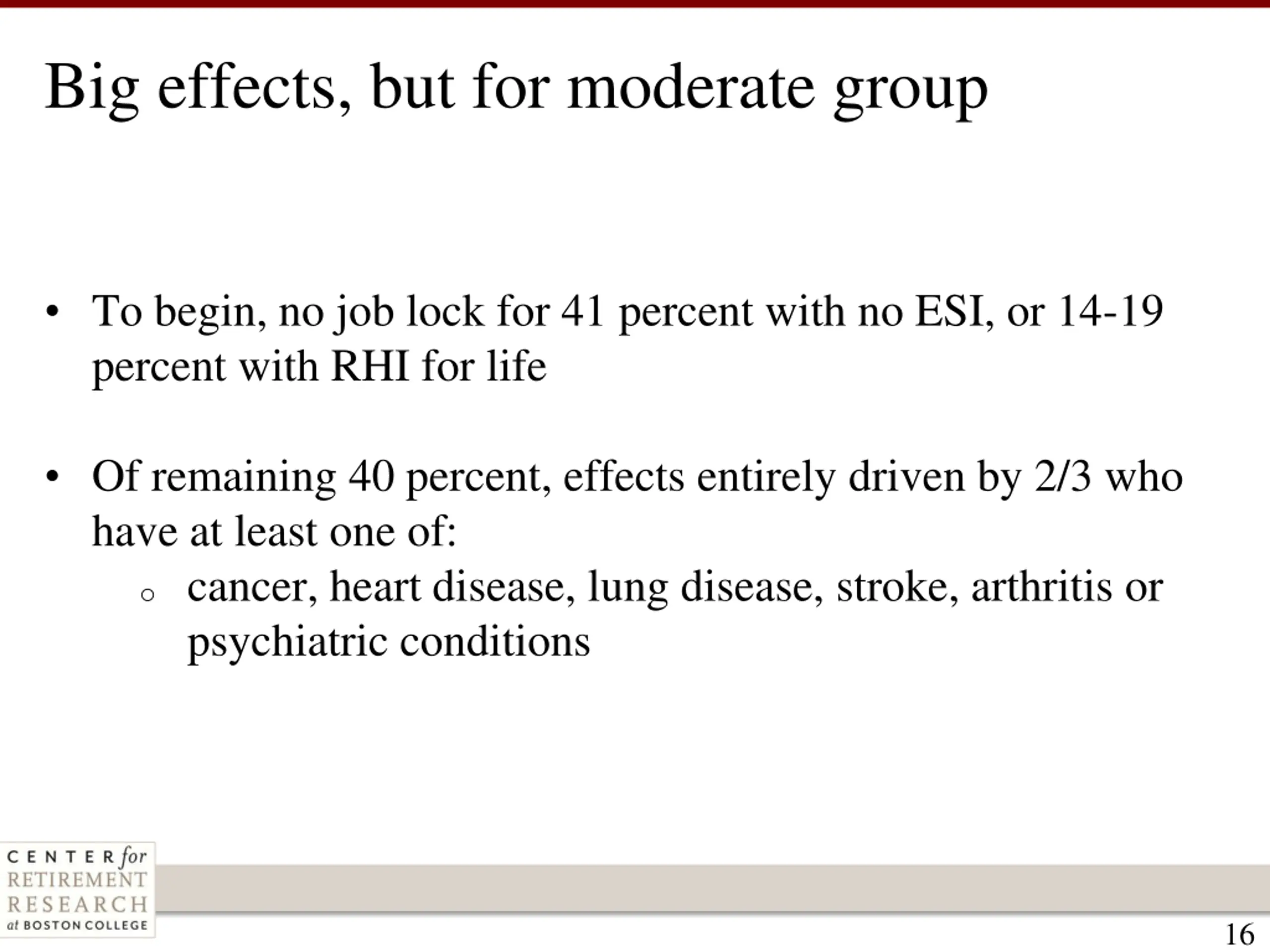 Big effects, but for moderate group To begin, no job lock for 41 percent with no ESI, or 14-19 percent with RHI for life Of remaining 40 percent, effects entirely driven by 2/3 who have at least one of: o cancer, heart disease, lung disease, stroke, arthritis or psychiatric conditions 16 16