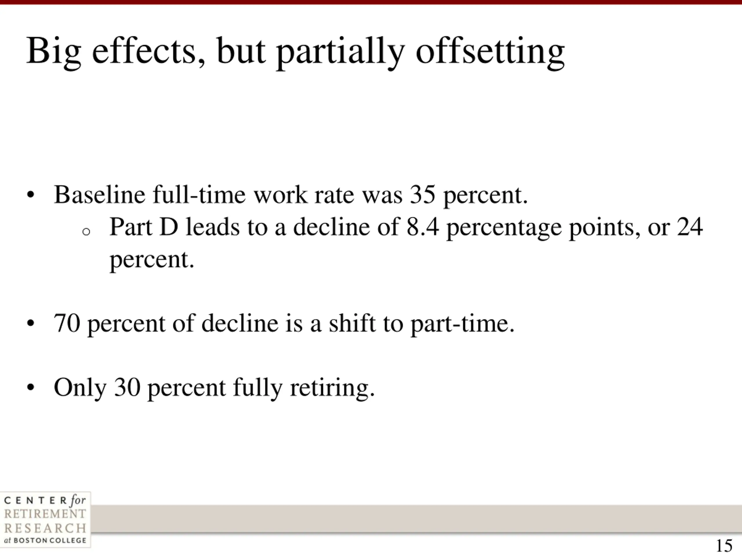 Big effects, but partially offsetting Baseline full-time work rate was 35 percent. o Part D leads to a decline of 8.4 percentage points, or 24 percent. 70 percent of decline is a shift to part-time. Only 30 percent fully retiring. 15 15