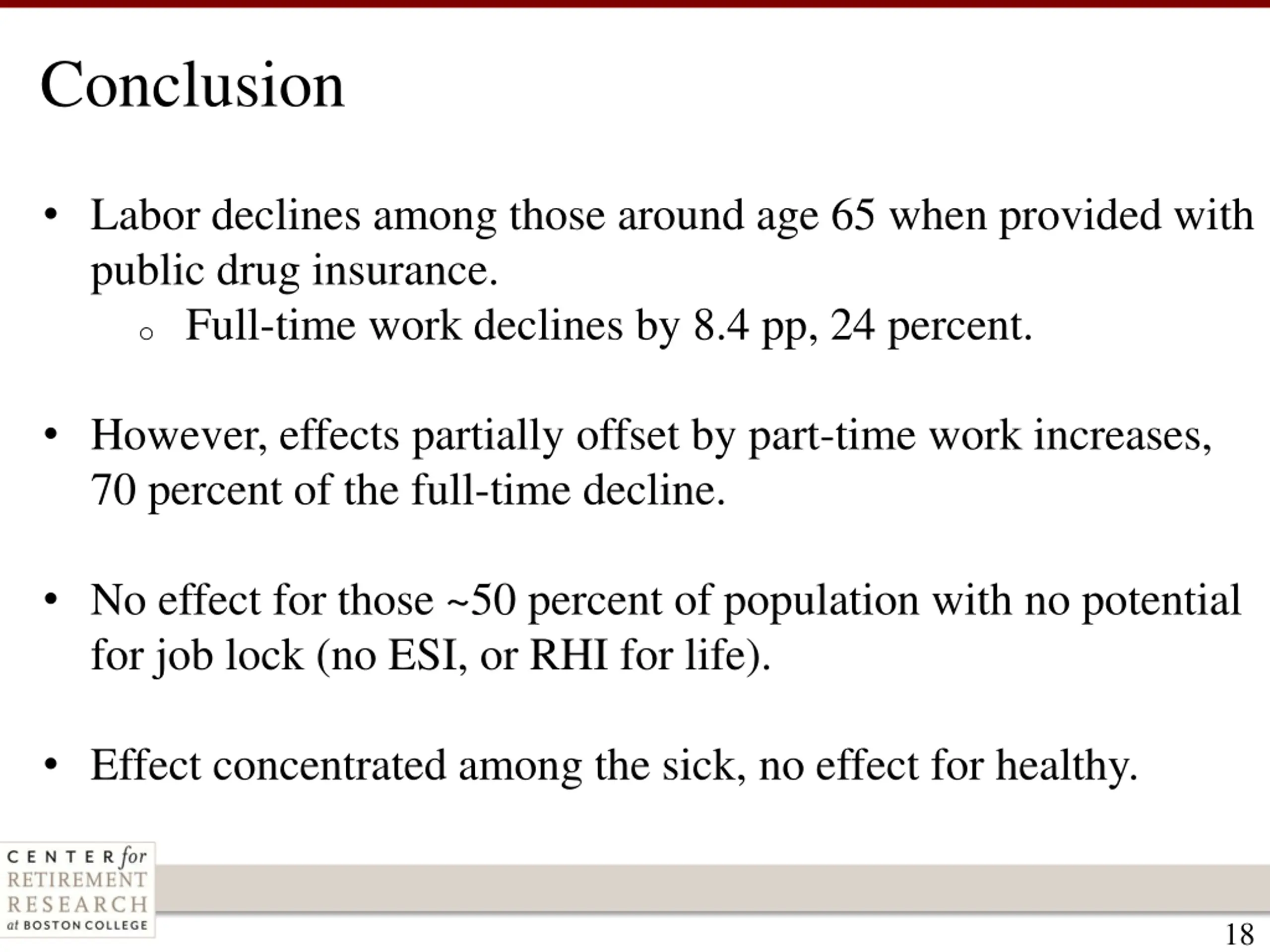 Conclusion Labor declines among those around age 65 when provided with public drug insurance. o Full-time work declines by 8.4 pp, 24 percent. However, effects partially offset by part-time work increases, 70 percent of the full-time decline. No effect for those ~50 percent of population with no potential for job lock (no ESI, or RHI for life). Effect concentrated among the sick, no effect for healthy. 18