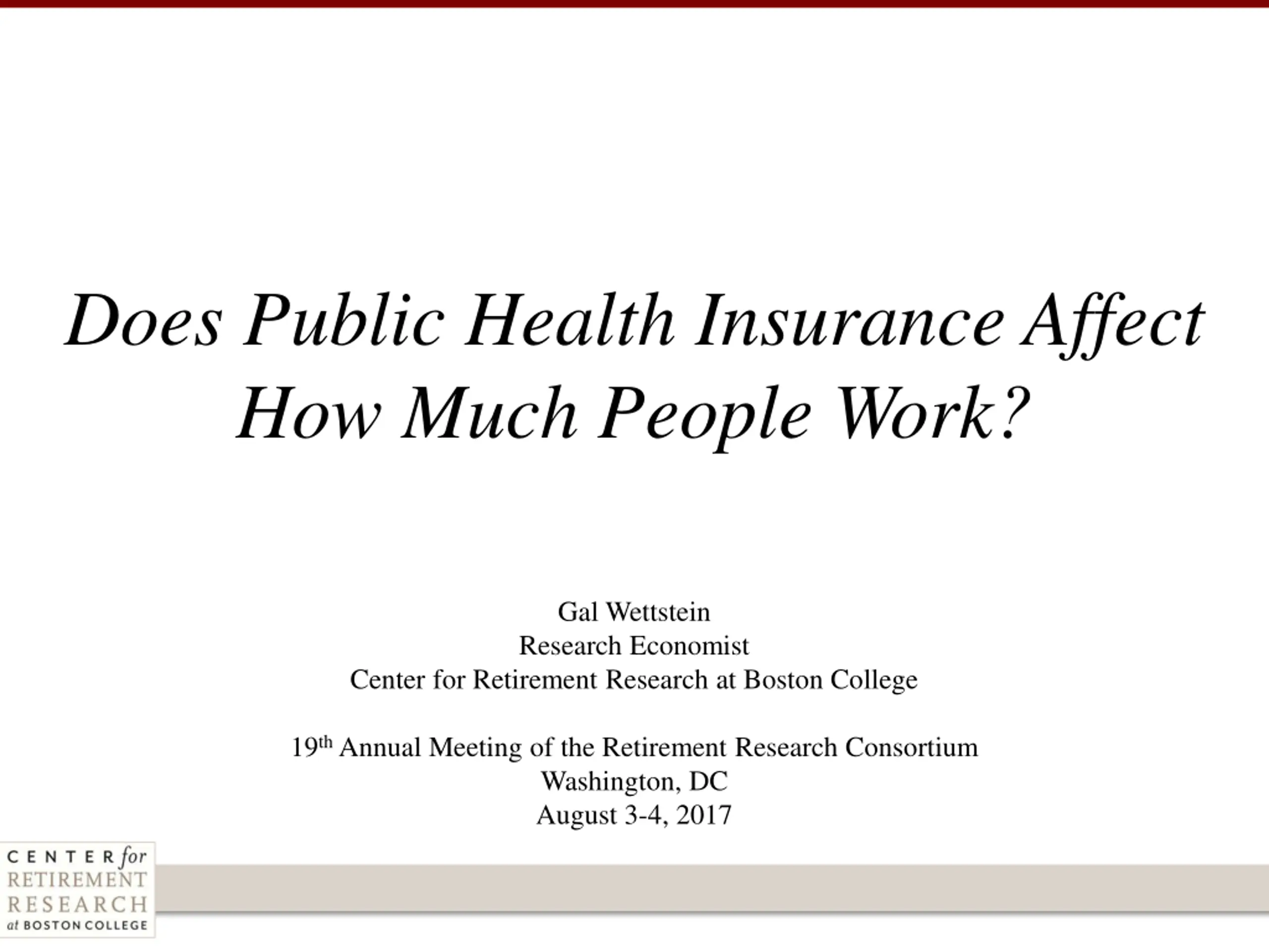 Does Public Health Insurance Affect How Much People Work? Gal Wettstein Research Economist Center for Retirement Research at Boston College 19th Annual Meeting of the Retirement Research Consortium Washington, DC August 3-4, 2017