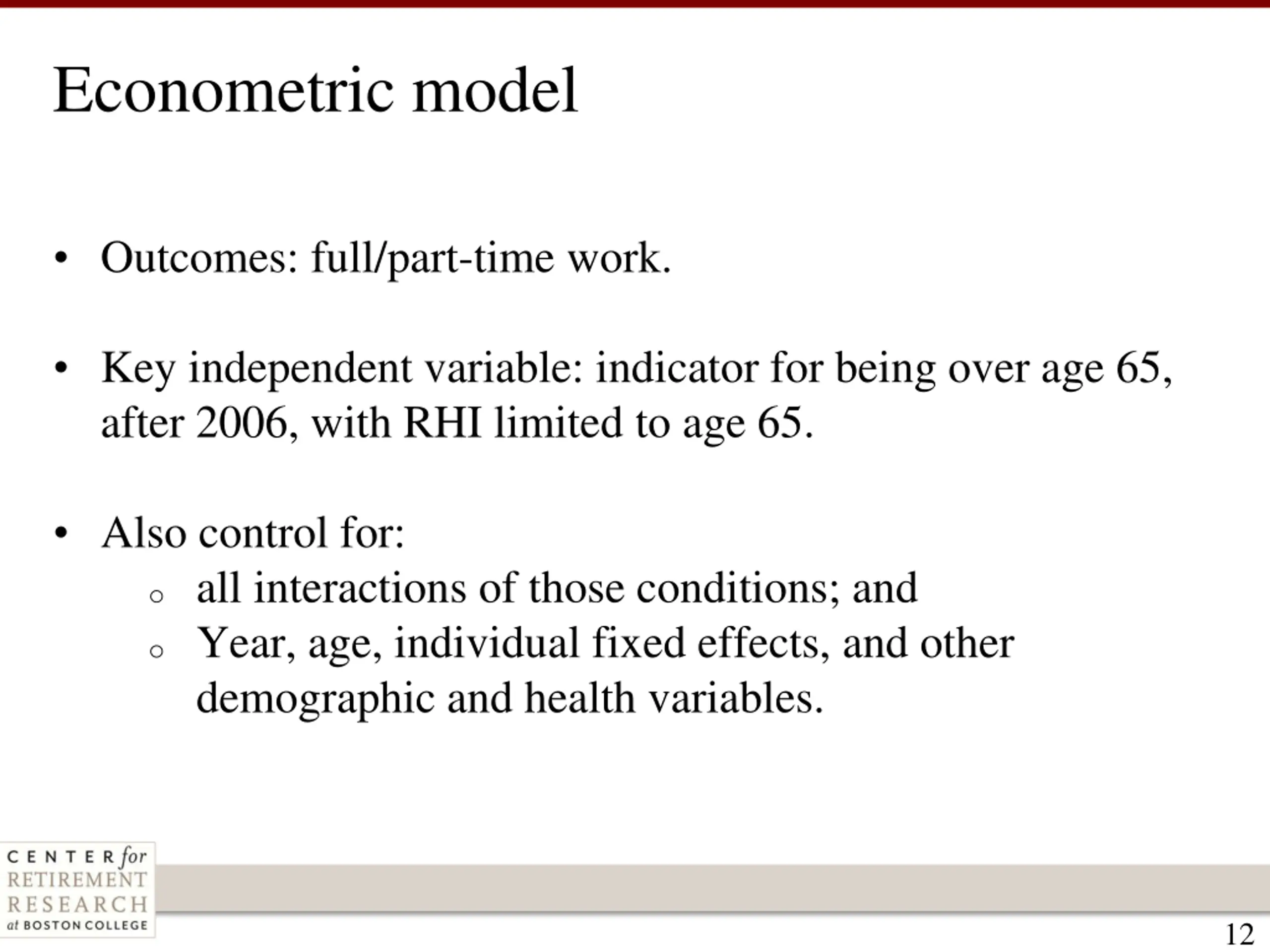 Econometric model Outcomes: full/part-time work. Key independent variable: indicator for being over age 65, after 2006, with RHI limited to age 65. Also control for: o all interactions of those conditions; and o Year, age, individual fixed effects, and other demographic and health variables. 12 12