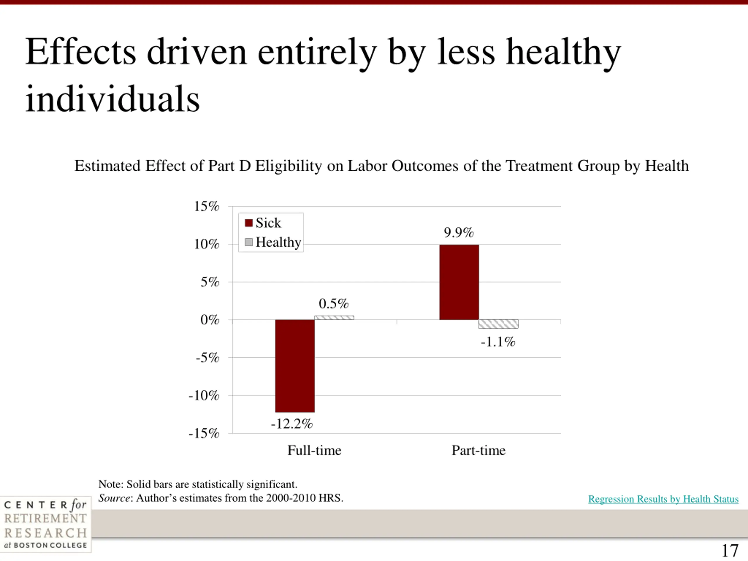 Effects driven entirely by less healthy individuals Estimated Effect of Part D Eligibility on Labor Outcomes of the Treatment Group by Health 15% Sick Healthy 9.9% 10% 5% 0.5% 0% -1.1% -5% -10% -12.2% -15% Full-time Part-time Note: Solid bars are statistically significant. Source: Author s estimates from the 2000-2010 HRS. Regression Results by Health Status 17 17