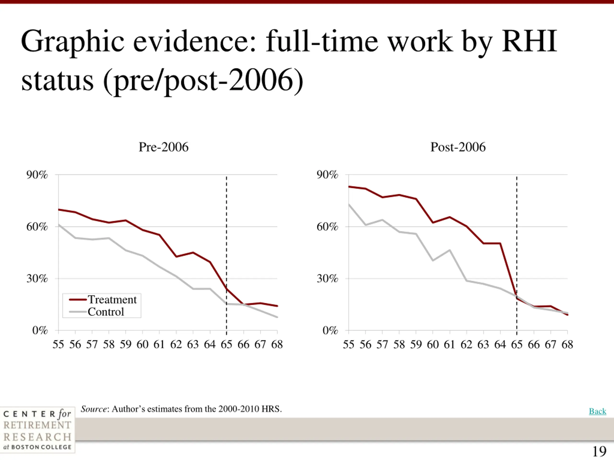 Graphic evidence: full-time work by RHI status (pre/post-2006) Pre-2006 Post-2006 90% 90% 60% 60% 30% 30% Treatment Control 0% 0% 55 56 57 58 59 60 61 62 63 64 65 66 67 68 55 56 57 58 59 60 61 62 63 64 65 66 67 68 Source: Author s estimates from the 2000-2010 HRS. Back 19 19