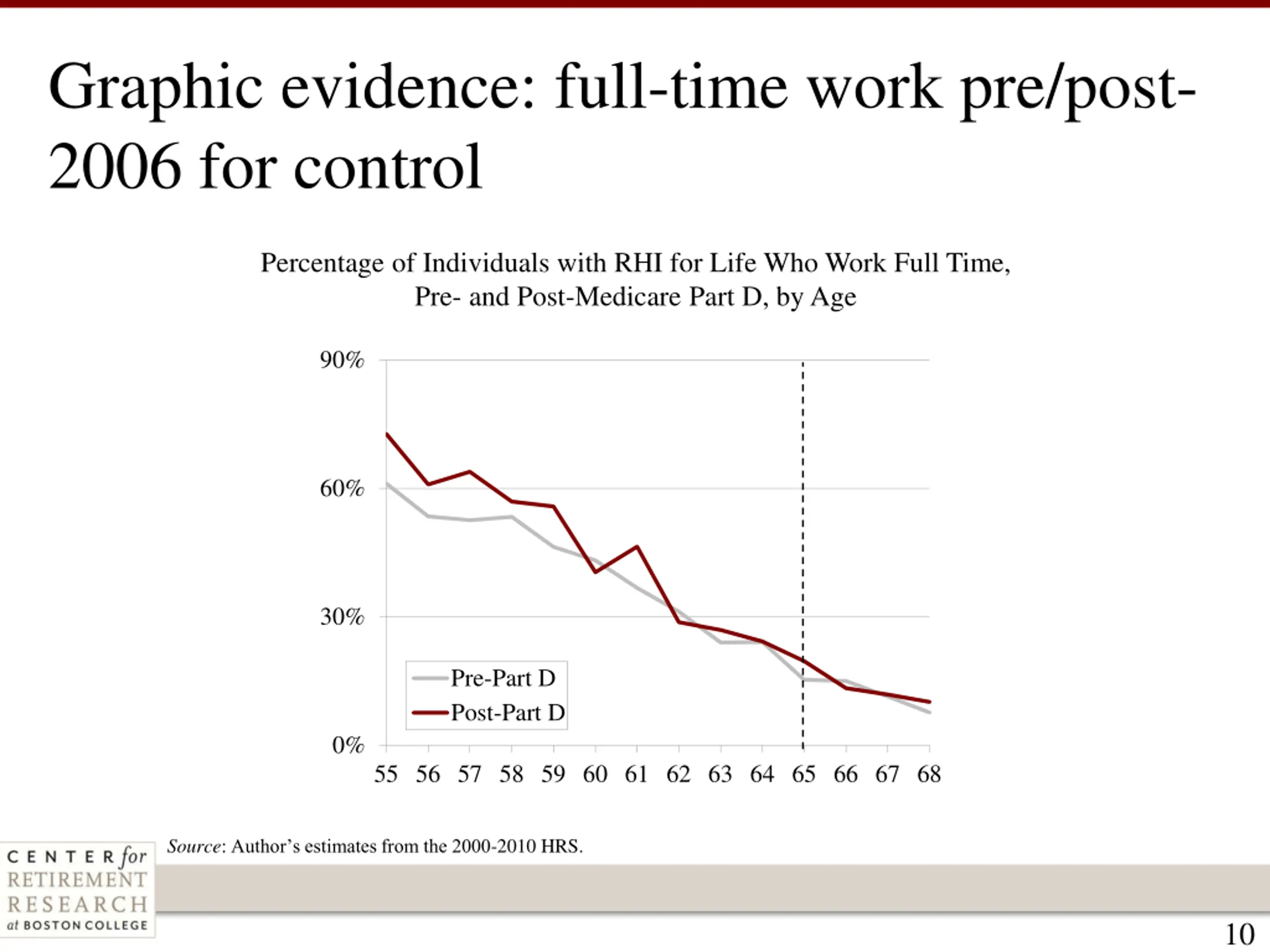 Graphic evidence: full-time work pre/post- 2006 for treated Percentage of Individuals with RHI Only Until Age 65 Who Work Full Time, Pre- and Post-Medicare Part D, by Age 90% 60% 30% Pre-Part D Post-Part D 0% 55 56 57 58 59 60 61 62 63 64 65 66 67 68 Note: For clarity, pre-2006 observations are shifted up so the mean of those below age 65 is the same before and after 2006. Source: Author s estimates from the 2000-2010 HRS. 9 9