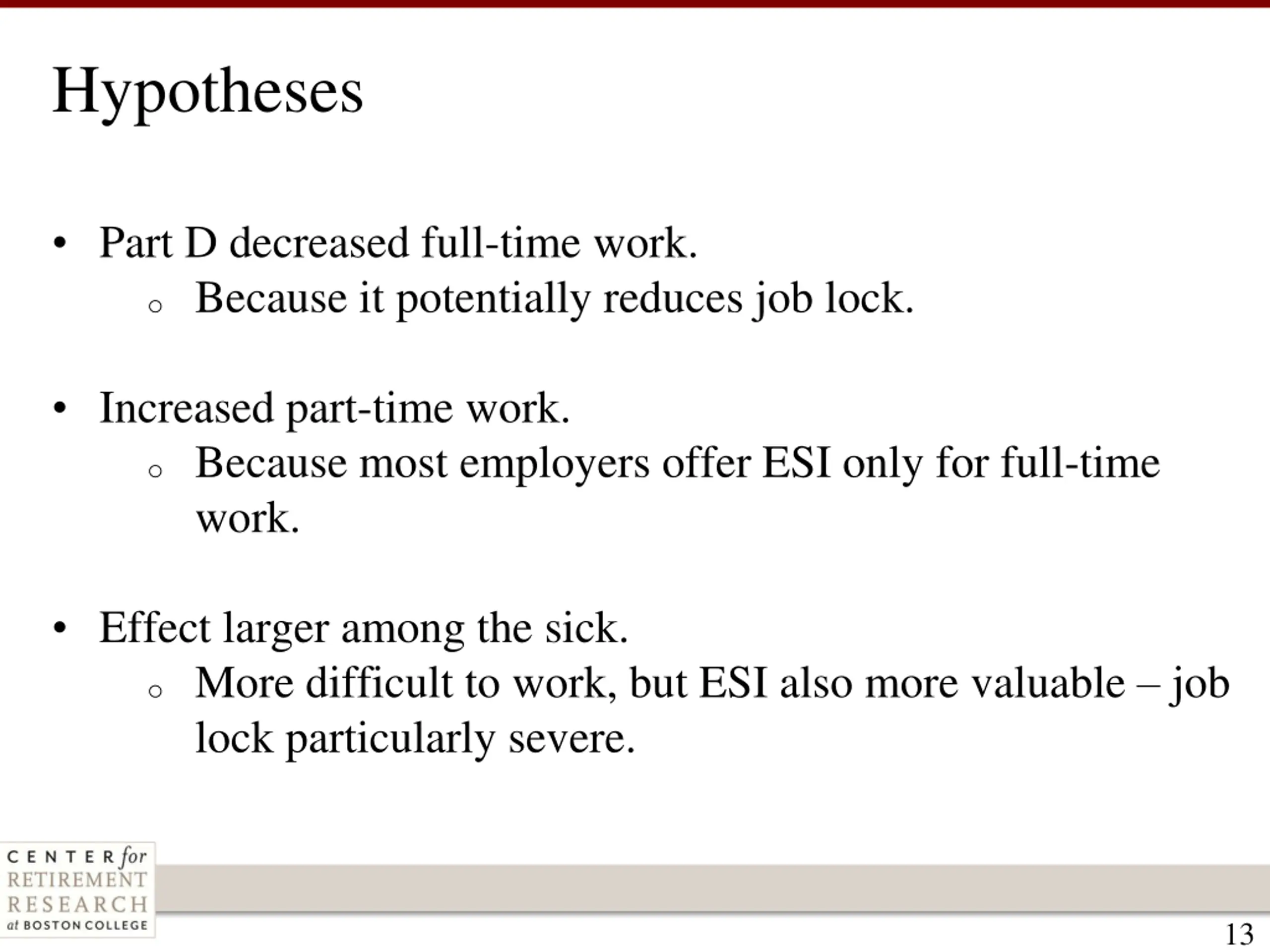 Hypotheses Part D decreased full-time work. o Because it potentially reduces job lock. Increased part-time work. o Because most employers offer ESI only for full-time work. Effect larger among the sick. o More difficult to work, but ESI also more valuable job lock particularly severe. 13 13