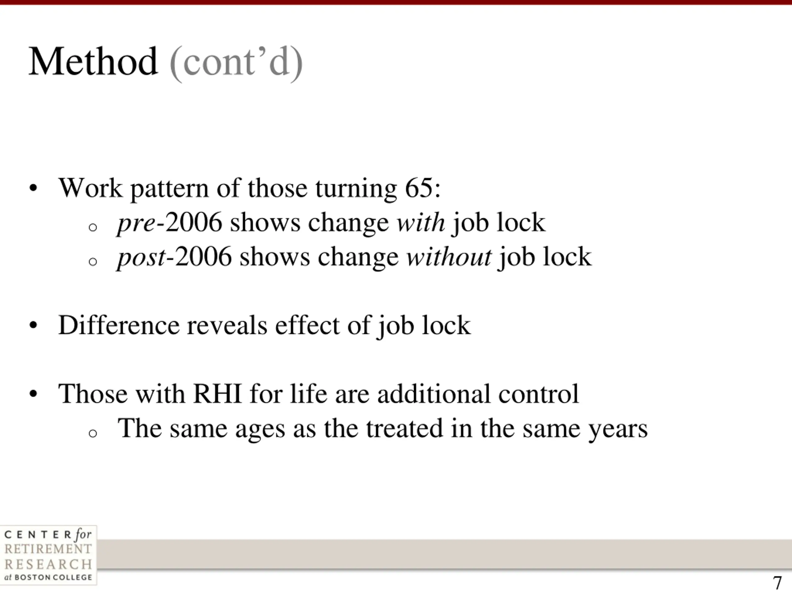 Method (contd) Work pattern of those turning 65: o pre-2006 shows change with job lock o post-2006 shows change without job lock Difference reveals effect of job lock Those with RHI for life are additional control o The same ages as the treated in the same years 7 7