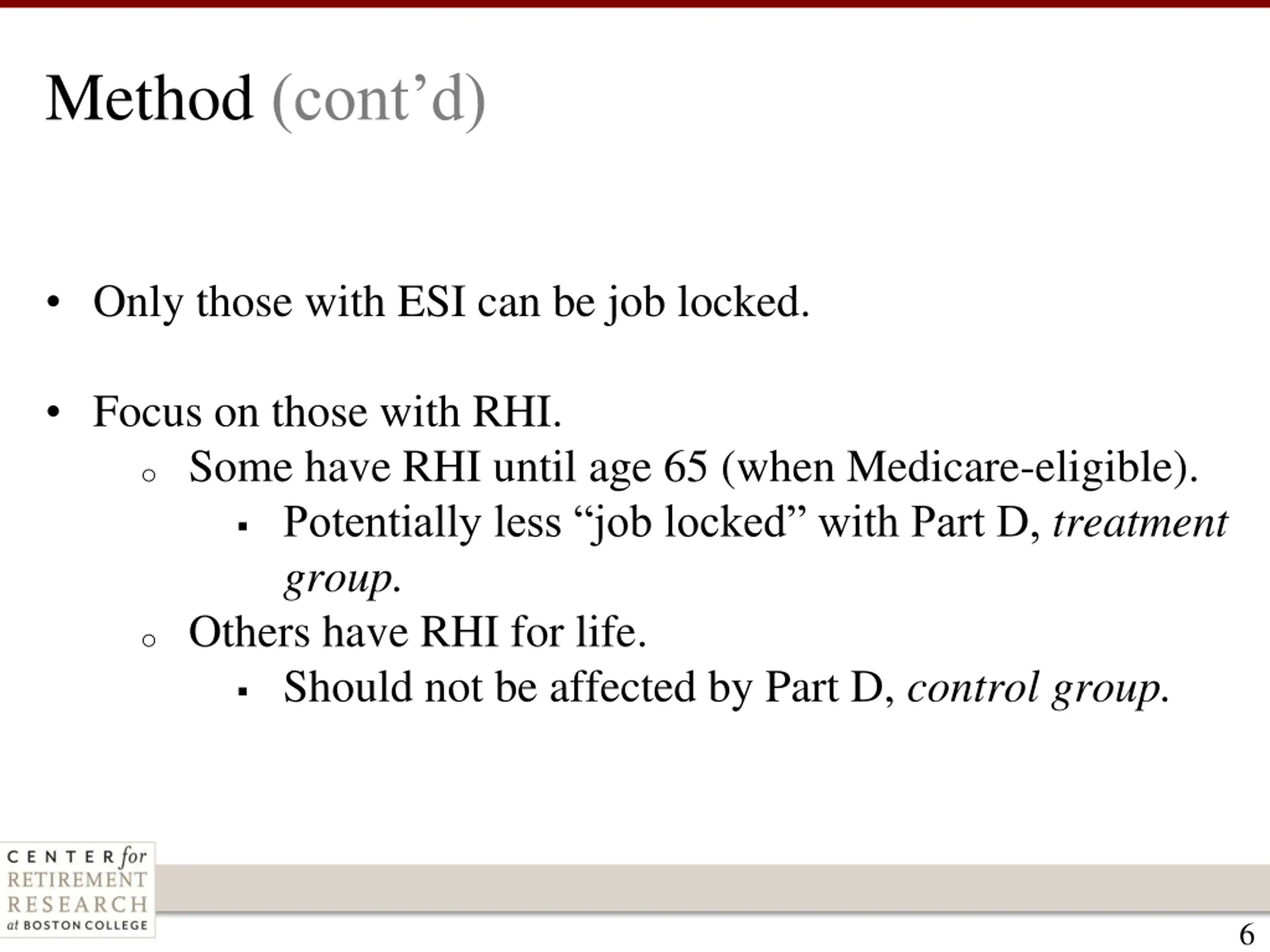 Method (contd) Only those with ESI can be job locked. Focus on those with RHI. o Some have RHI until age 65 (when Medicare-eligible). Potentially less job locked with Part D, treatment group. o Others have RHI for life. Should not be affected by Part D, control group. 6 6