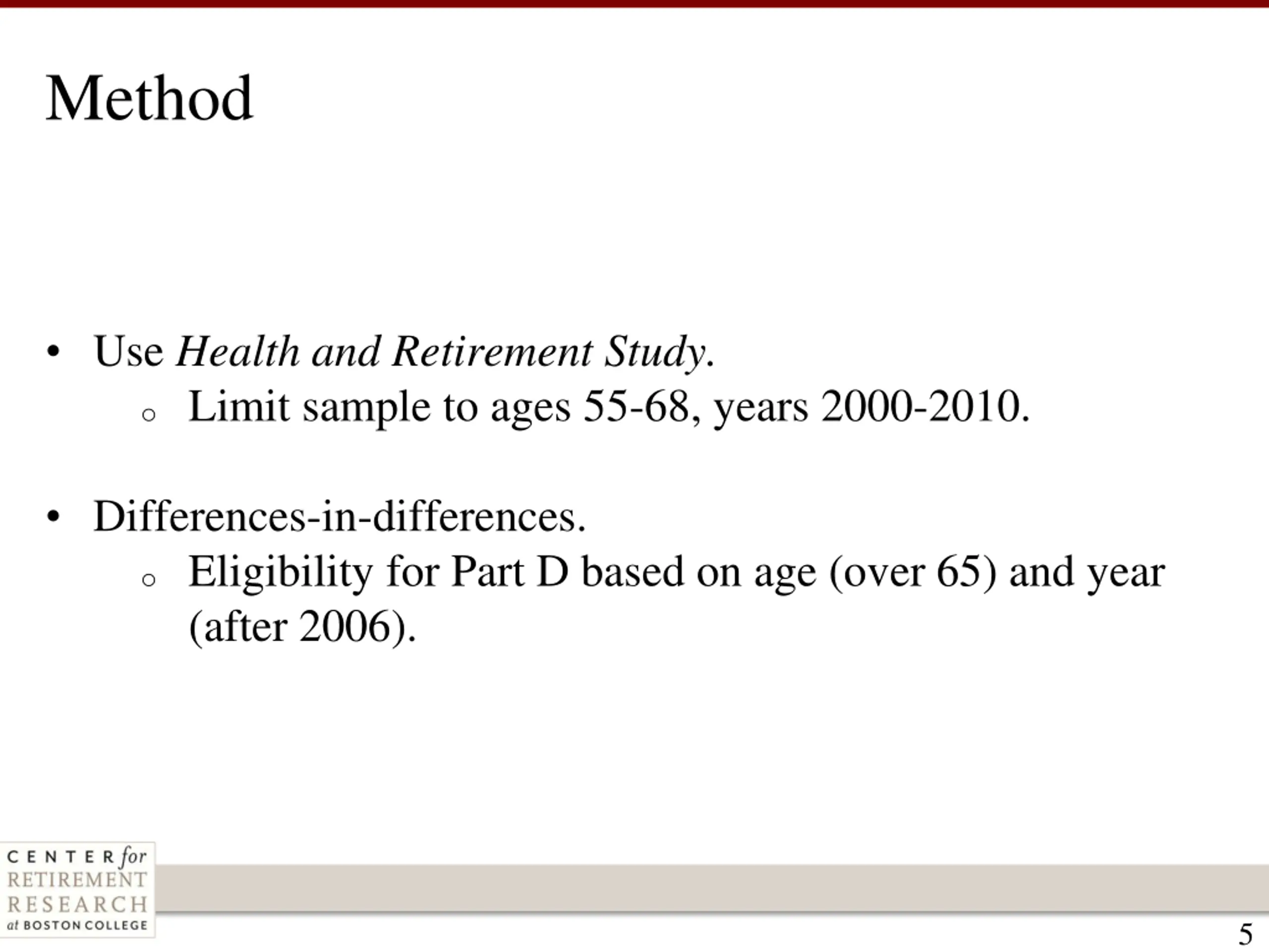 Method Use Health and Retirement Study. o Limit sample to ages 55-68, years 2000-2010. Differences-in-differences. o Eligibility for Part D based on age (over 65) and year (after 2006). 5 5