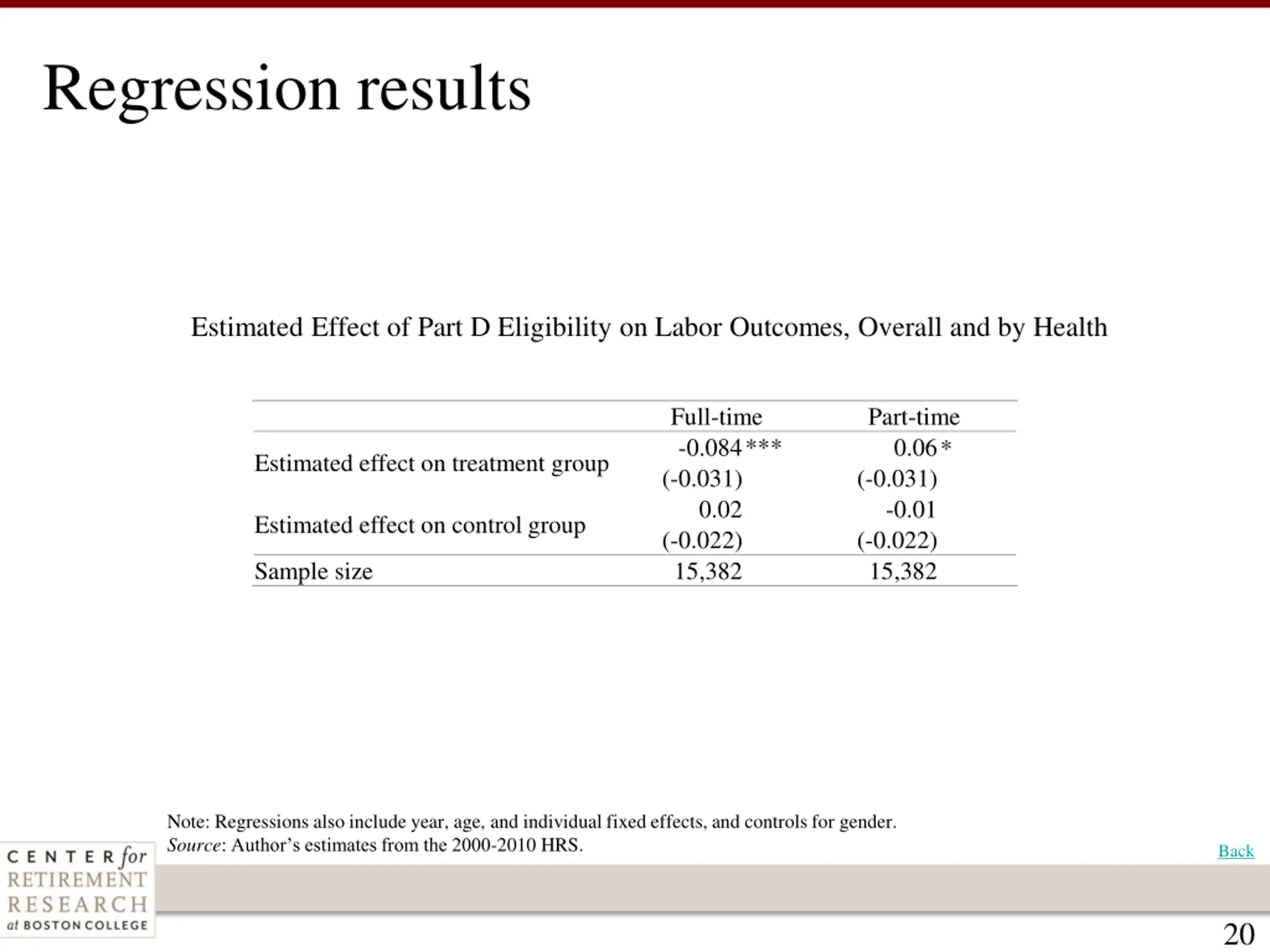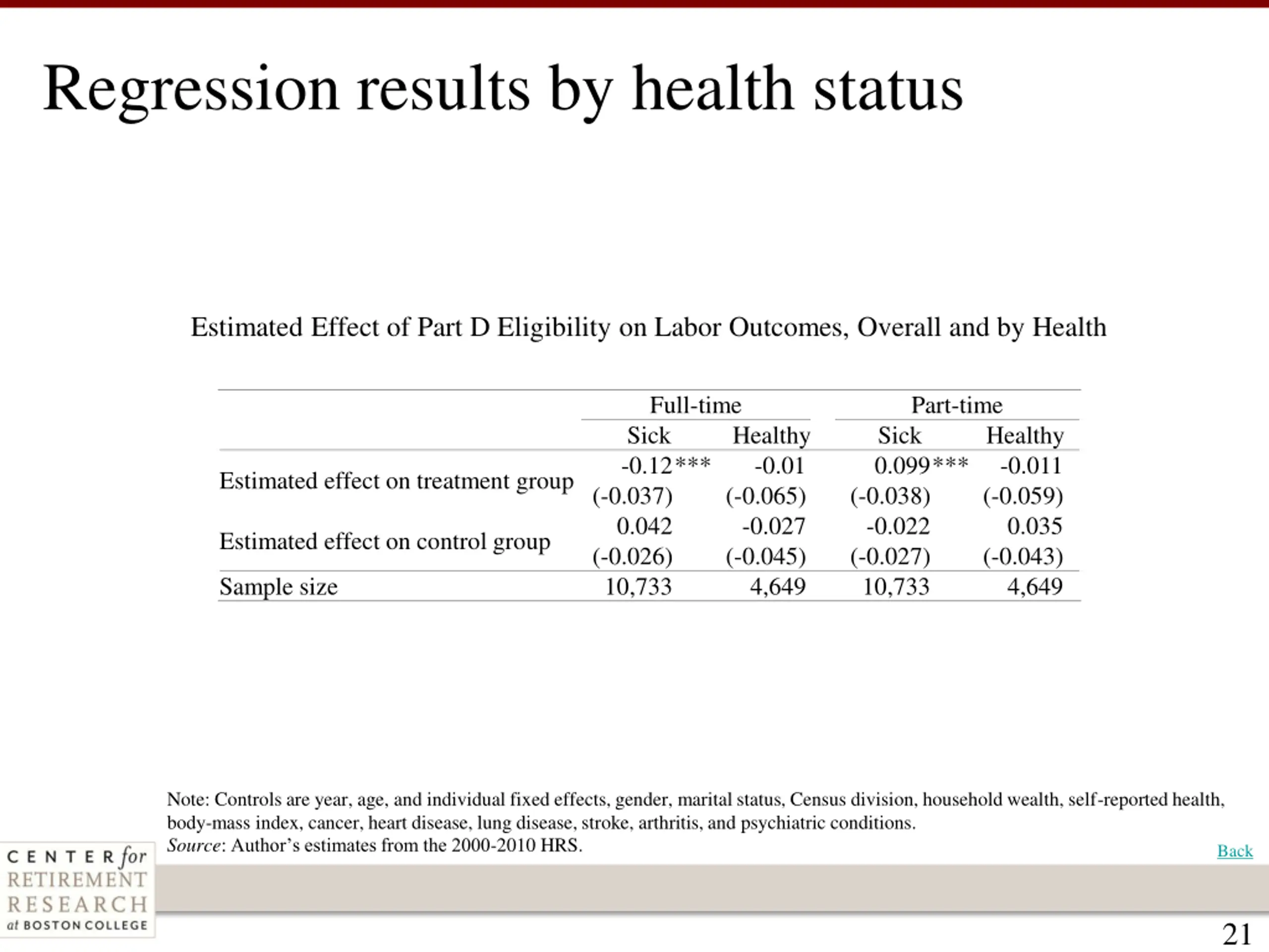 Regression results Estimated Effect of Part D Eligibility on Labor Outcomes, Overall and by Health Full-time -0.084*** (-0.031) 0.02 (-0.022) 15,382 Part-time 0.06* (-0.031) -0.01 (-0.022) 15,382 Estimated effect on treatment group Estimated effect on control group Sample size Note: Regressions also include year, age, and individual fixed effects, and controls for gender. Source: Author s estimates from the 2000-2010 HRS. Back 20 20
