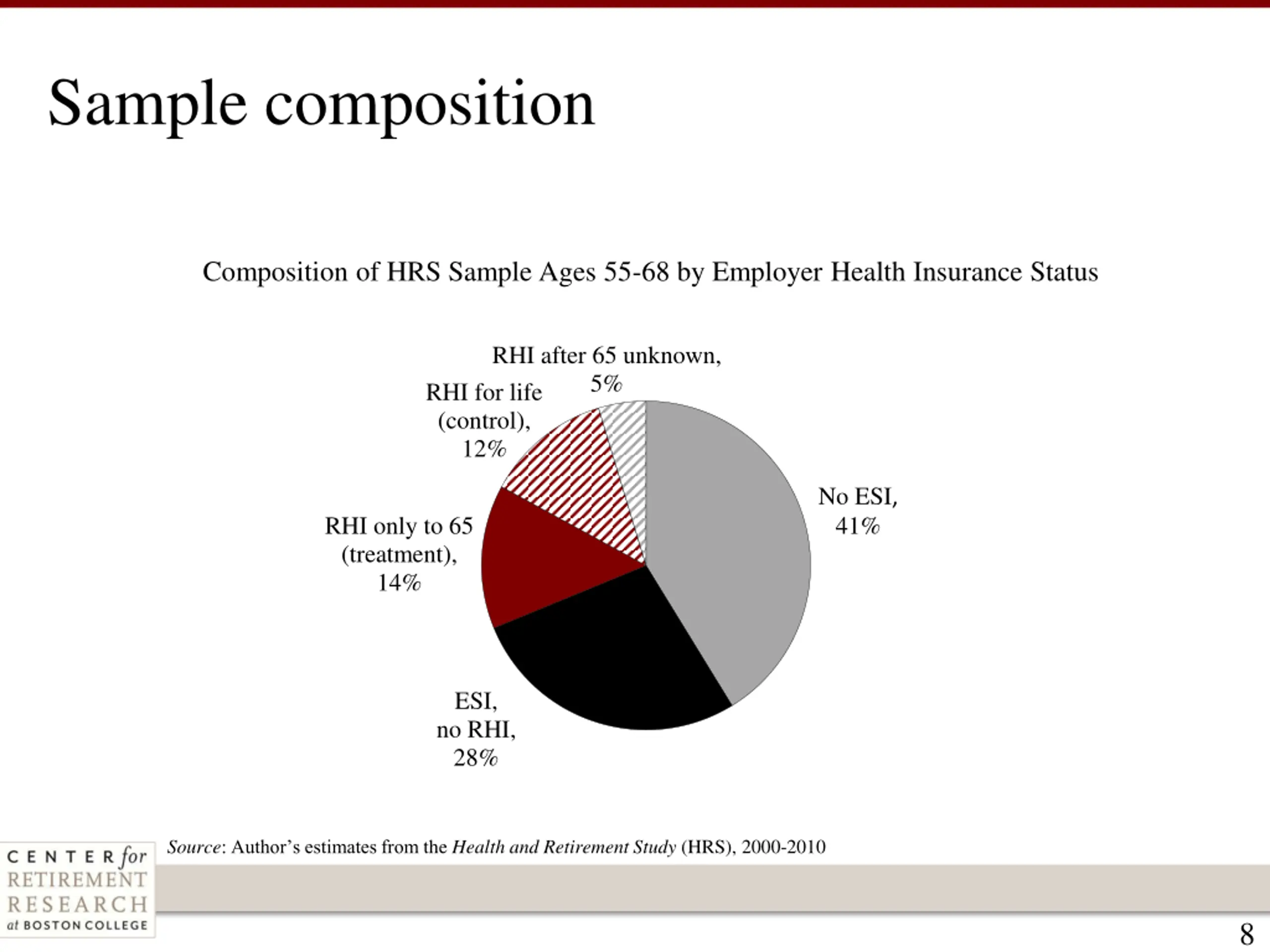 Sample composition Composition of HRS Sample Ages 55-68 by Employer Health Insurance Status RHI after 65 unknown, 5% RHI for life (control), 12% No ESI, 41% RHI only to 65 (treatment), 14% ESI, no RHI, 28% Source: Author s estimates from the Health and Retirement Study (HRS), 2000-2010 8 8