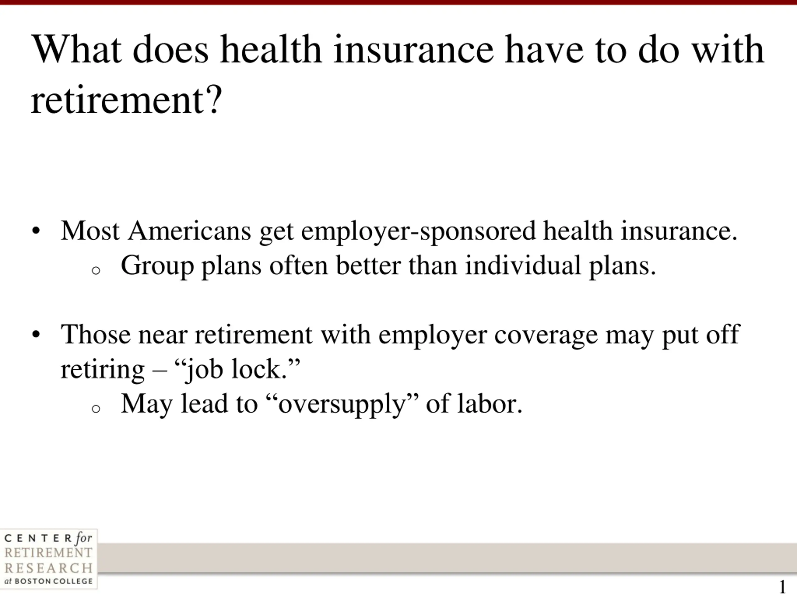 What does health insurance have to do with retirement? Most Americans get employer-sponsored health insurance. o Group plans often better than individual plans. Those near retirement with employer coverage may put off retiring job lock. o May lead to oversupply of labor. 1 1