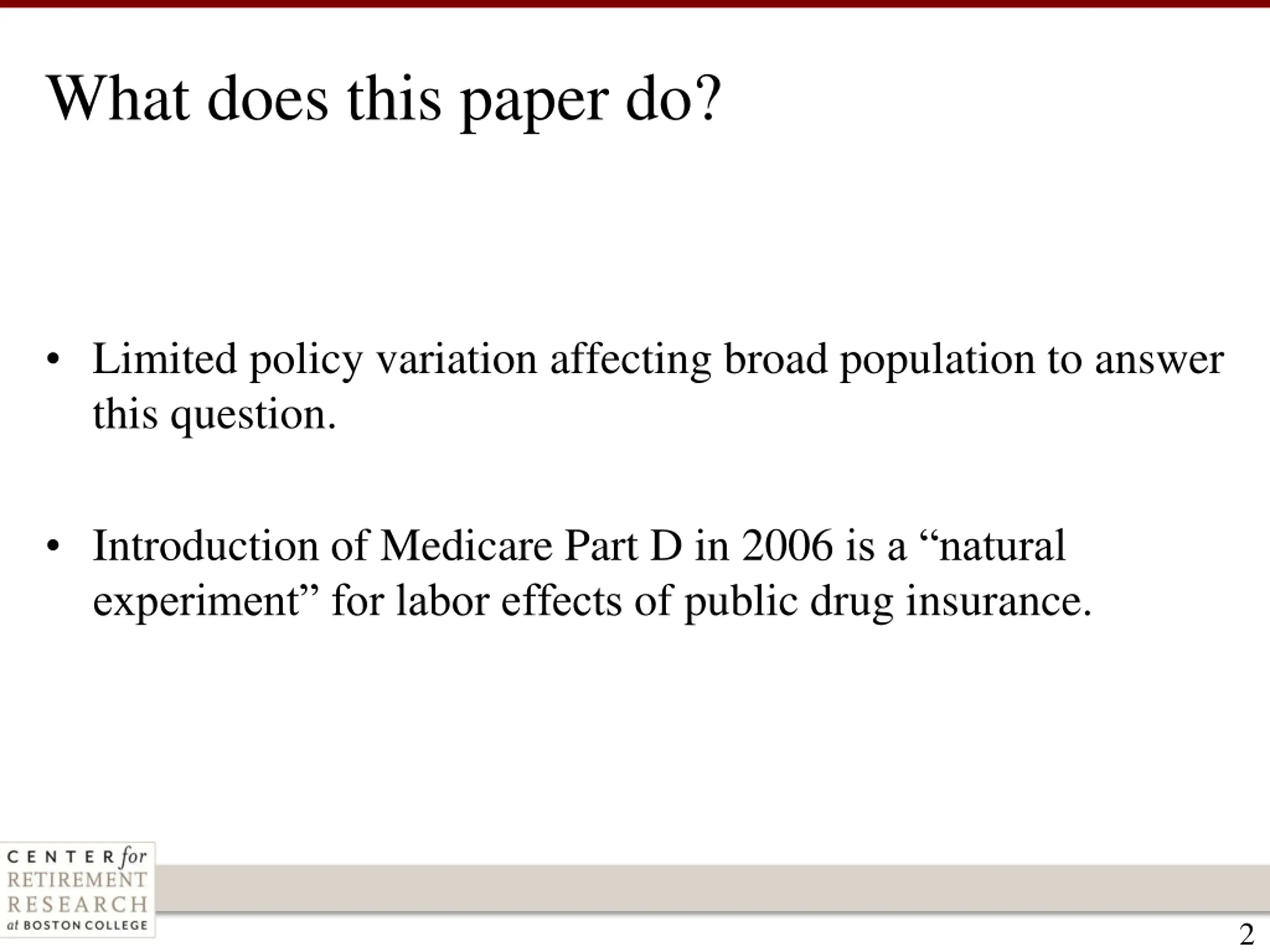 What does this paper do? Limited policy variation affecting broad population to answer this question. Introduction of Medicare Part D in 2006 is a natural experiment for labor effects of public drug insurance. 2 2