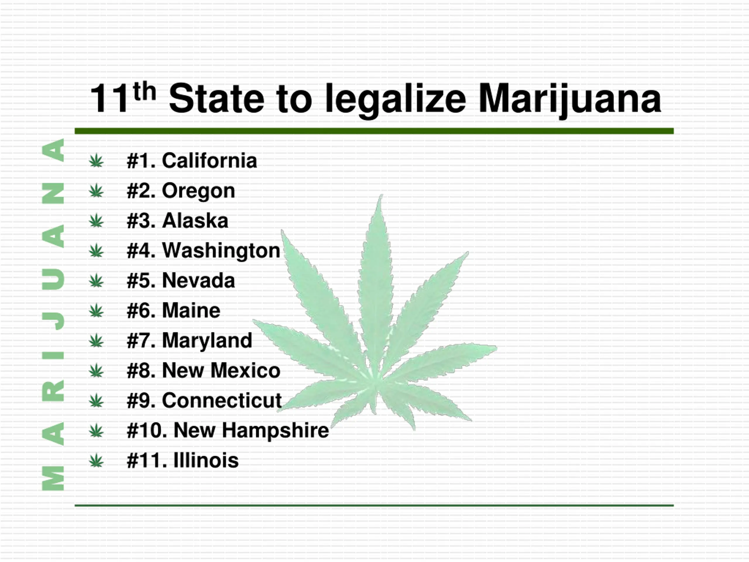 11thState to legalize Marijuana M A R I J U A N A M A R I J U A N A #1. California #2. Oregon #3. Alaska #4. Washington #5. Nevada #6. Maine #7. Maryland #8. New Mexico #9. Connecticut #10. New Hampshire #11. Illinois