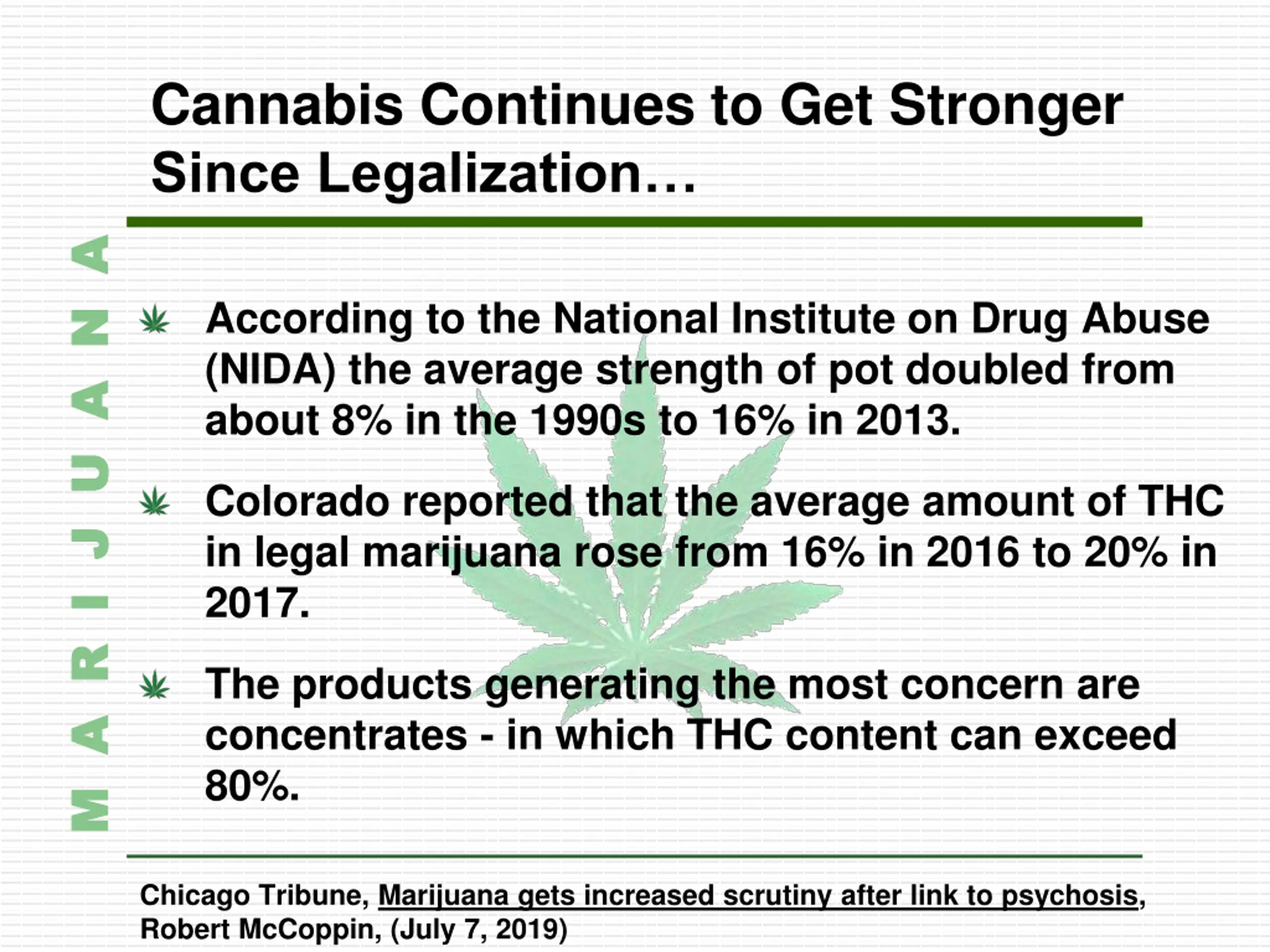 Cannabis Continues to Get Stronger Since Legalization M A R I J U A N A M A R I J U A N A According to the National Institute on Drug Abuse (NIDA) the average strength of pot doubled from about 8% in the 1990s to 16% in 2013. Colorado reported that the average amount of THC in legal marijuana rose from 16% in 2016 to 20% in 2017. The products generating the most concern are concentrates - in which THC content can exceed 80%. Chicago Tribune, Marijuana gets increased scrutiny after link to psychosis, Robert McCoppin, (July 7, 2019)