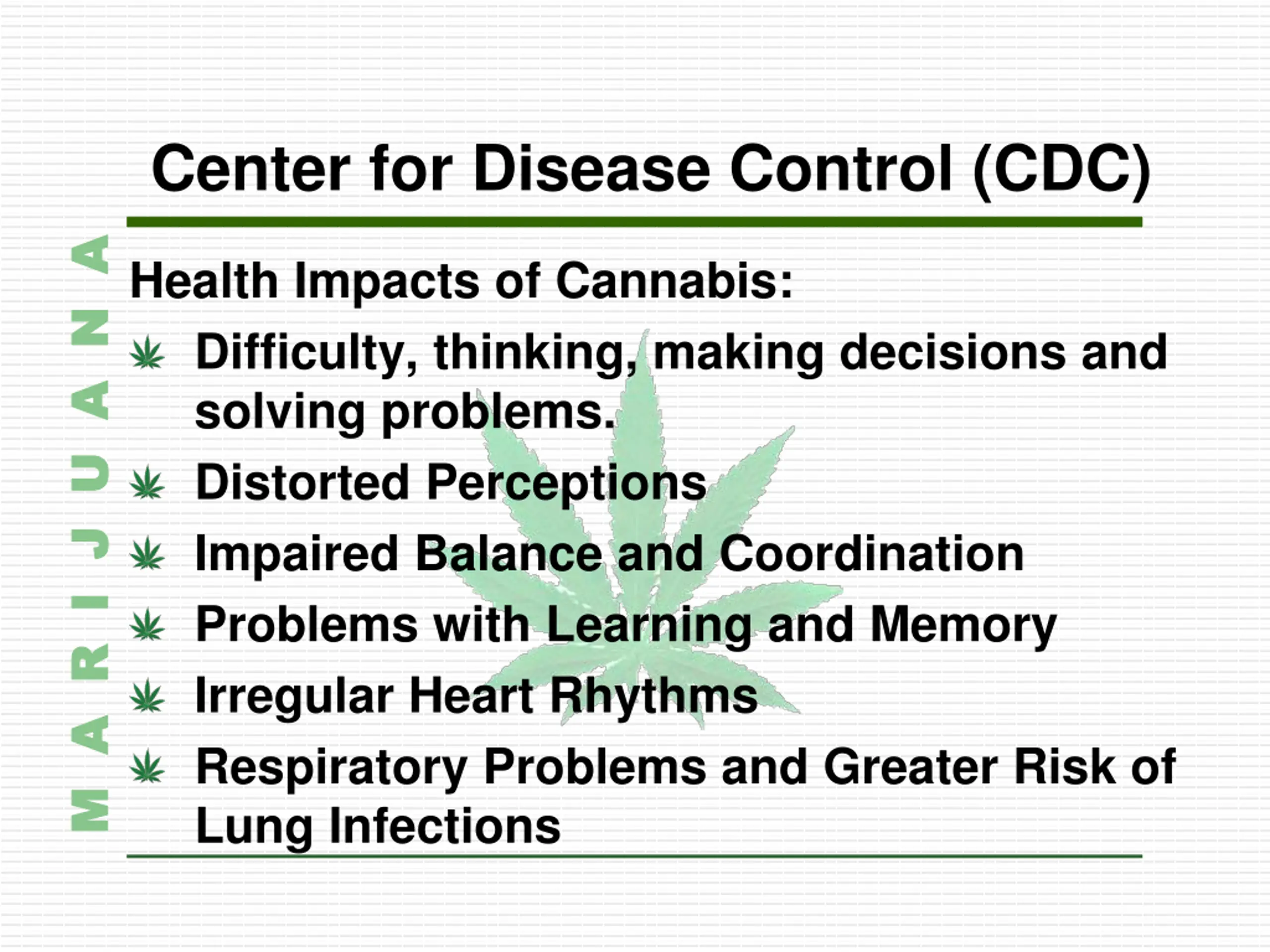 Center for Disease Control (CDC) M A R I J U A N A M A R I J U A N A Health Impacts of Cannabis: Difficulty, thinking, making decisions and solving problems. Distorted Perceptions Impaired Balance and Coordination Problems with Learning and Memory Irregular Heart Rhythms Respiratory Problems and Greater Risk of Lung Infections