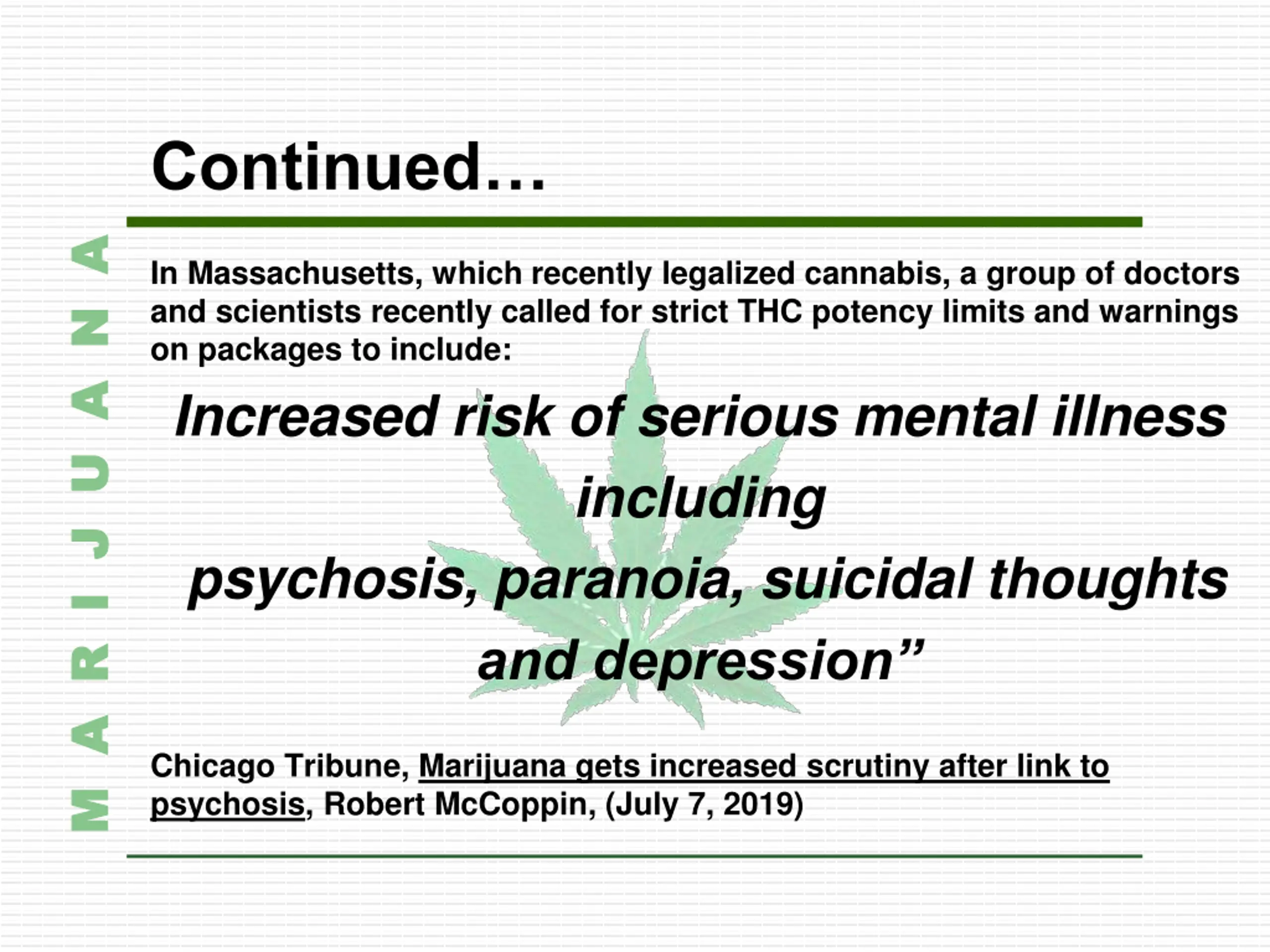 Continued M A R I J U A N A M A R I J U A N A In Massachusetts, which recently legalized cannabis, a group of doctors and scientists recently called for strict THC potency limits and warnings on packages to include: Increased risk of serious mental illness including psychosis, paranoia, suicidal thoughts and depression Chicago Tribune, Marijuana gets increased scrutiny after link to psychosis, Robert McCoppin, (July 7, 2019)
