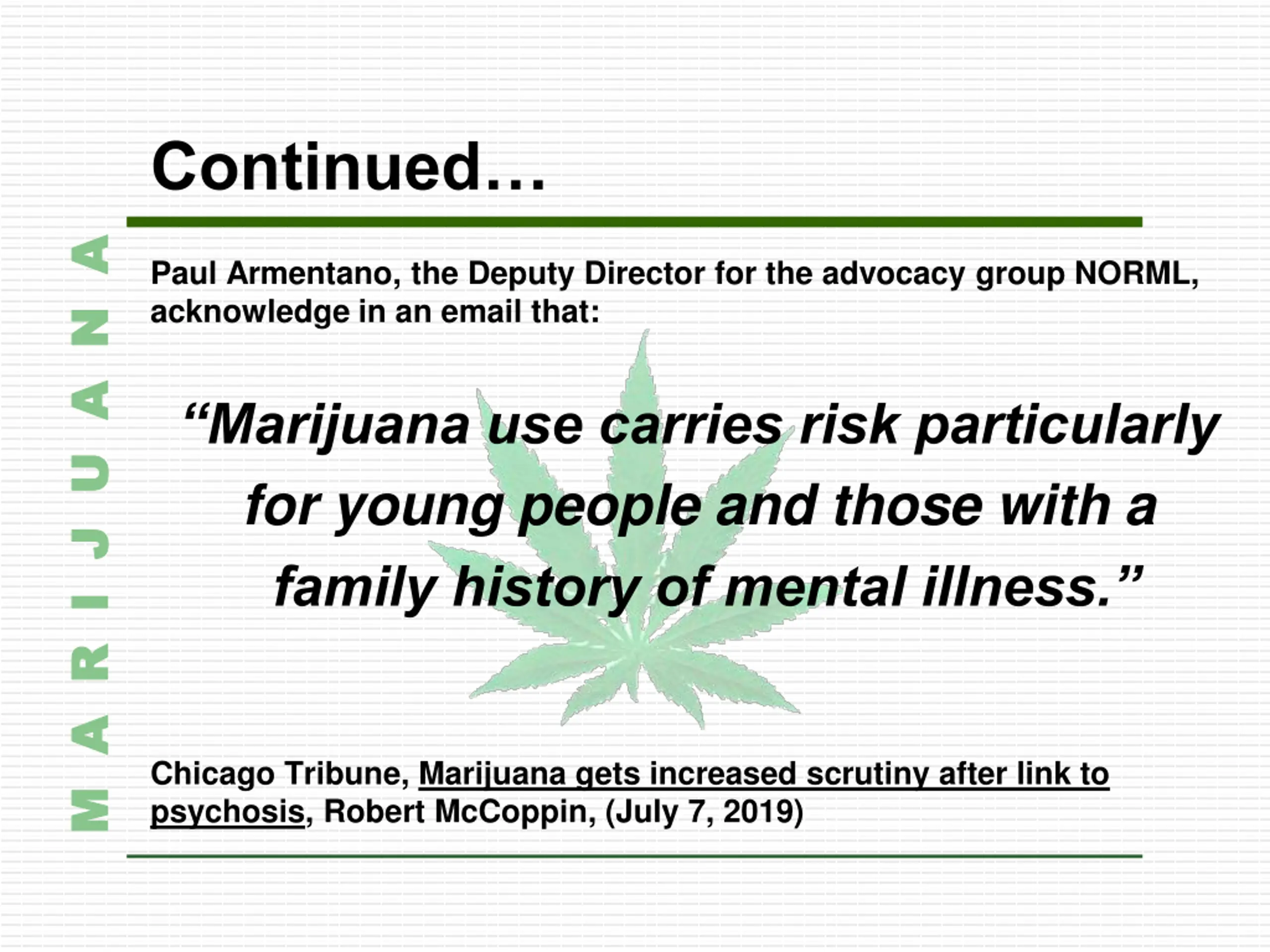 Continued M A R I J U A N A M A R I J U A N A Paul Armentano, the Deputy Director for the advocacy group NORML, acknowledge in an email that: Marijuana use carries risk particularly for young people and those with a family history of mental illness. Chicago Tribune, Marijuana gets increased scrutiny after link to psychosis, Robert McCoppin, (July 7, 2019)