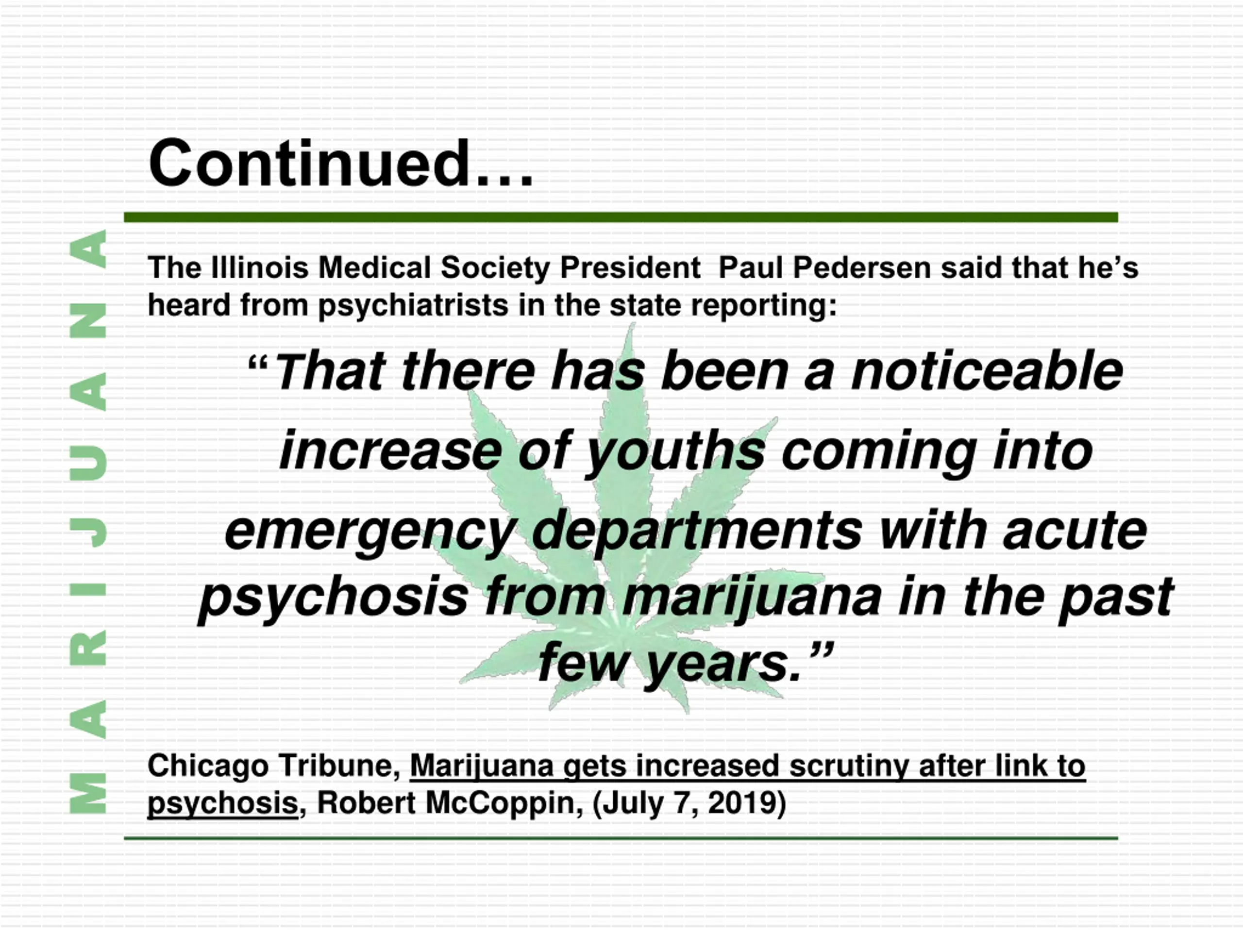 Continued M A R I J U A N A M A R I J U A N A The Illinois Medical Society President Paul Pedersen said that he s heard from psychiatrists in the state reporting: That there has been a noticeable increase of youths coming into emergency departments with acute psychosis from marijuana in the past few years. Chicago Tribune, Marijuana gets increased scrutiny after link to psychosis, Robert McCoppin, (July 7, 2019)