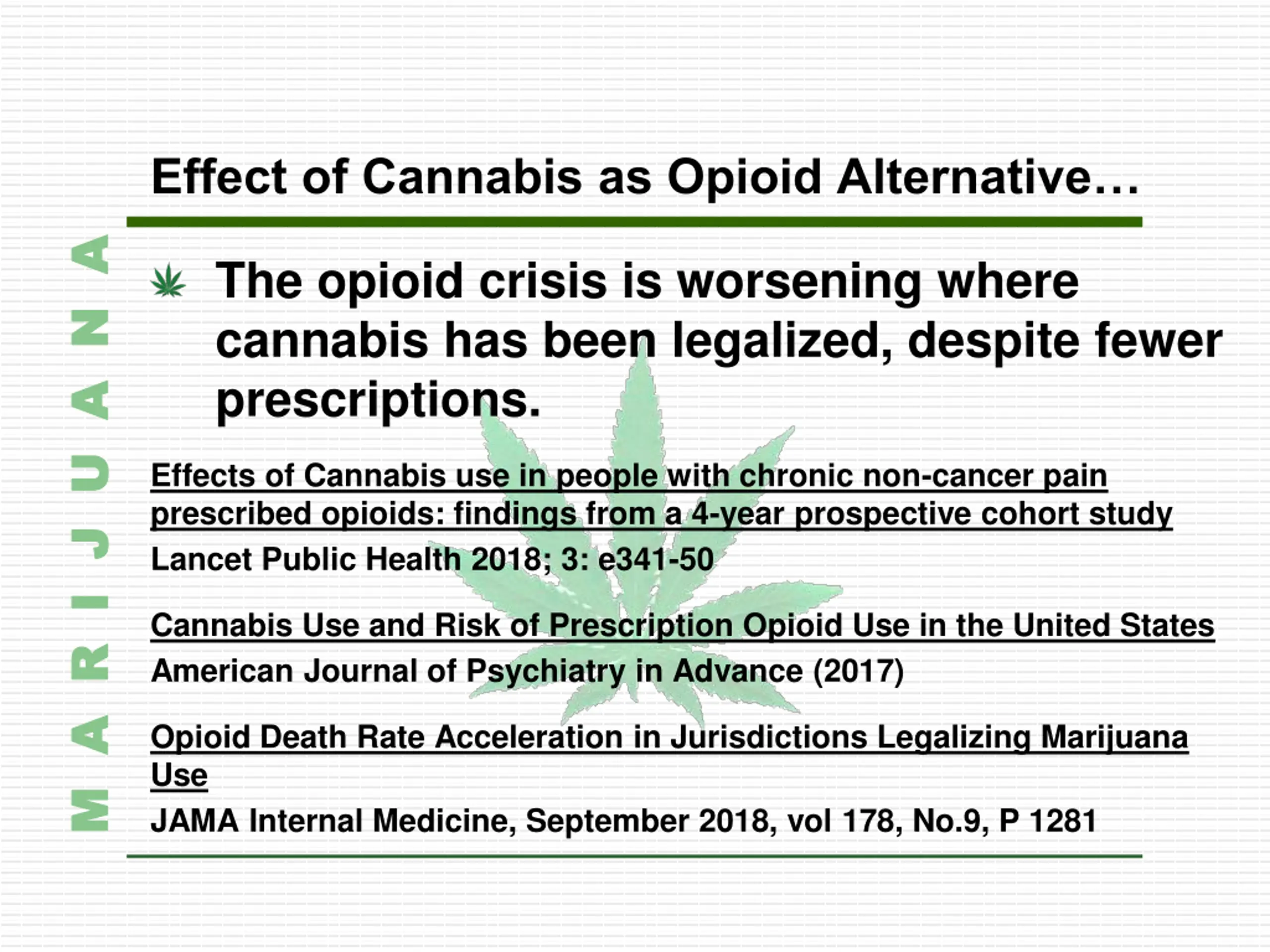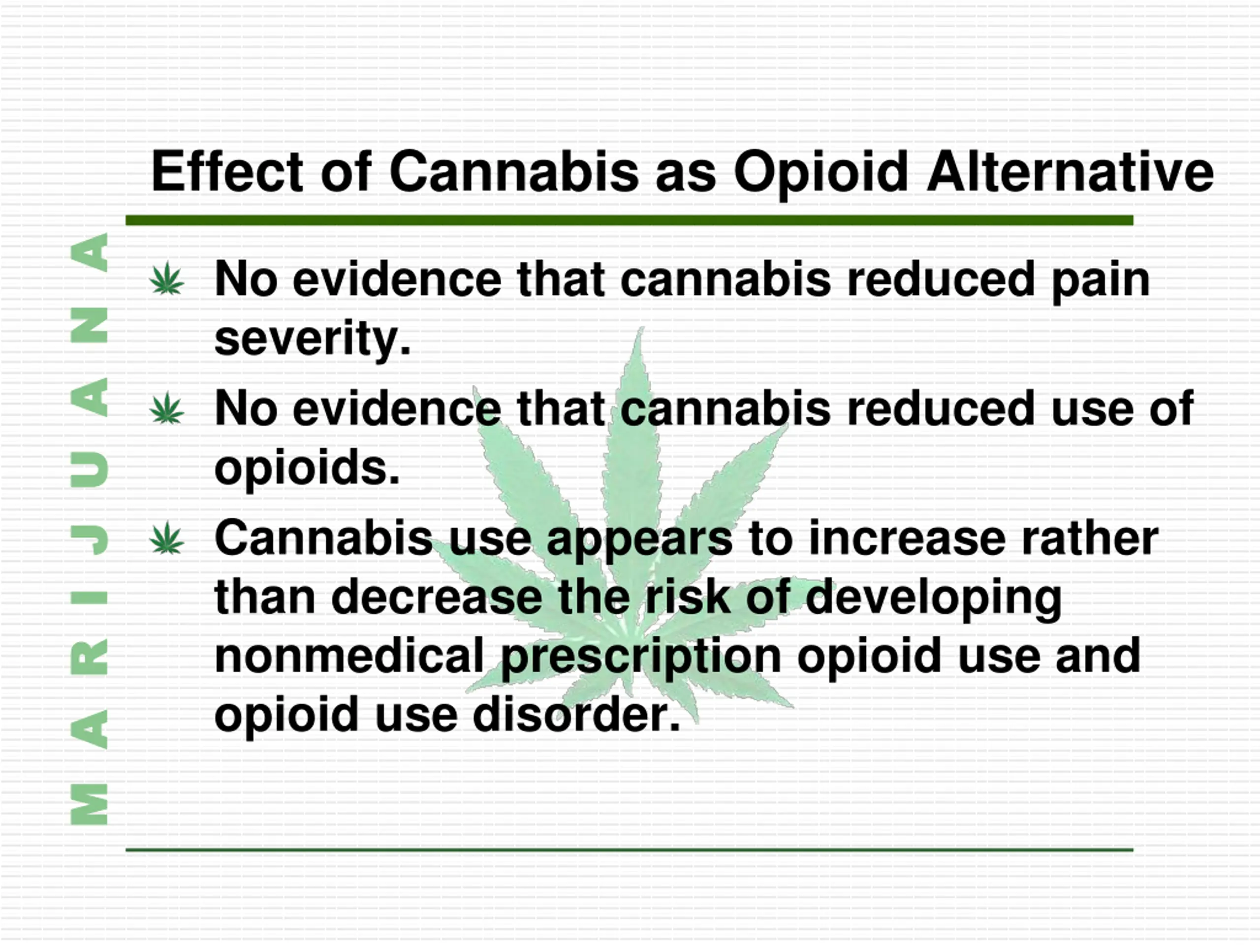 Effect of Cannabis as Opioid Alternative M A R I J U A N A M A R I J U A N A No evidence that cannabis reduced pain severity. No evidence that cannabis reduced use of opioids. Cannabis use appears to increase rather than decrease the risk of developing nonmedical prescription opioid use and opioid use disorder.