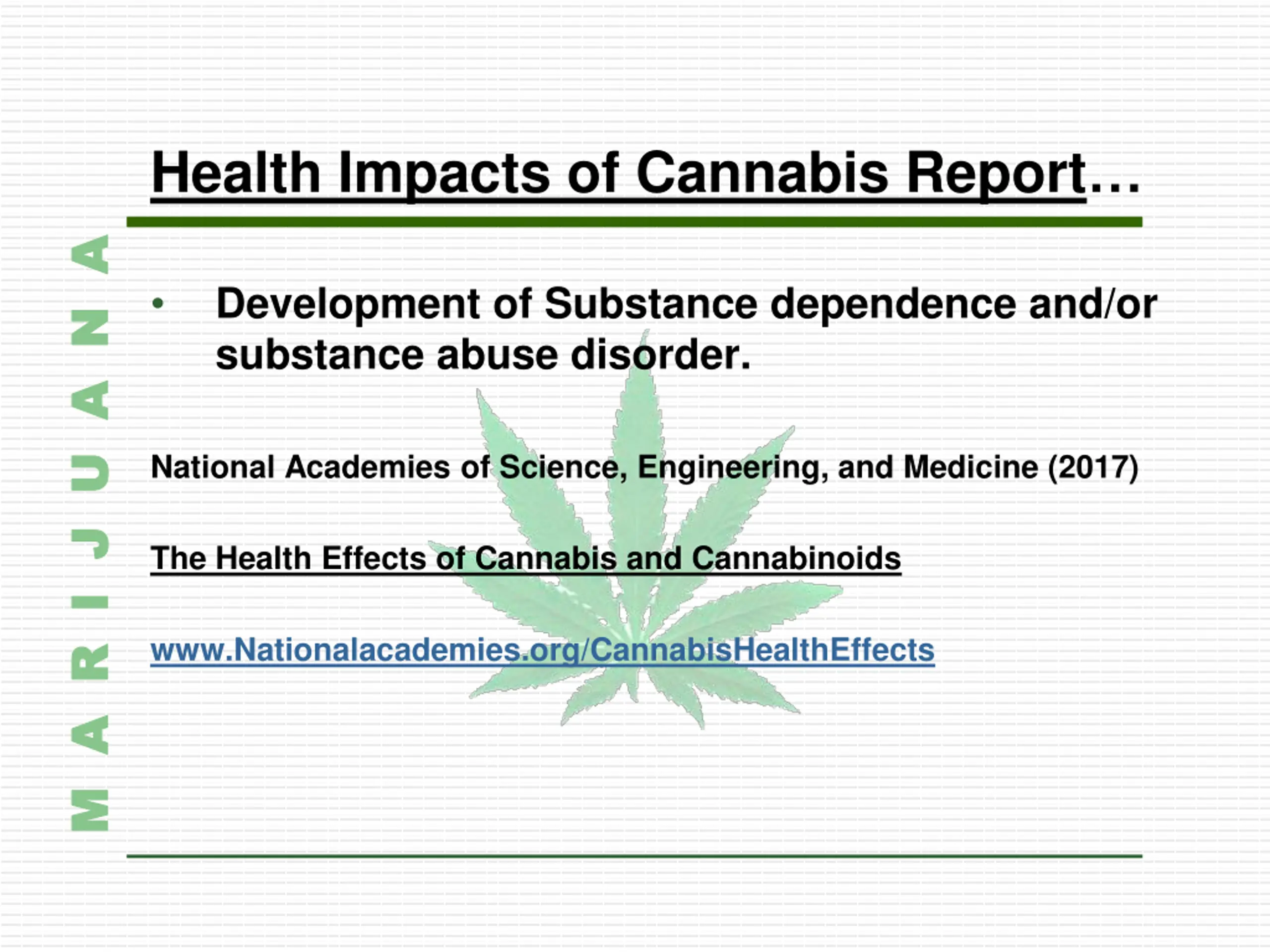 Health Impacts of Cannabis Report M A R I J U A N A M A R I J U A N A Development of Substance dependence and/or substance abuse disorder. National Academies of Science, Engineering, and Medicine (2017) The Health Effects of Cannabis and Cannabinoids www.Nationalacademies.org/CannabisHealthEffects