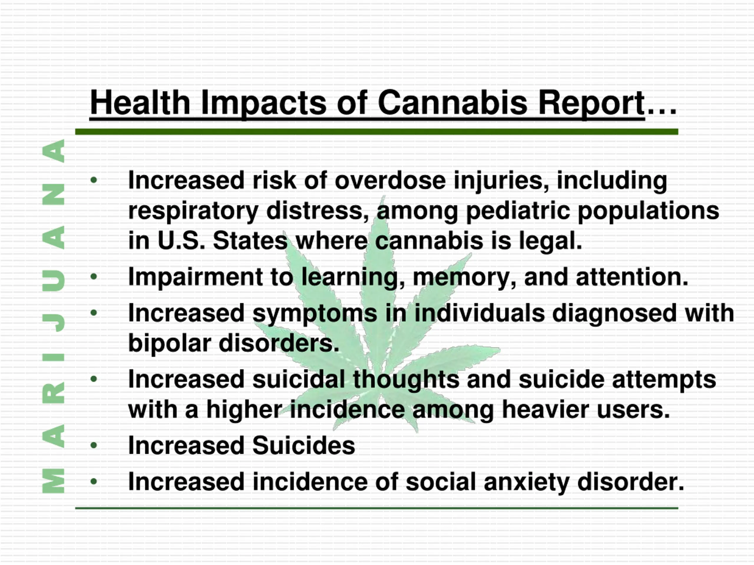 Health Impacts of Cannabis Report M A R I J U A N A M A R I J U A N A Increased risk of overdose injuries, including respiratory distress, among pediatric populations in U.S. States where cannabis is legal. Impairment to learning, memory, and attention. Increased symptoms in individuals diagnosed with bipolar disorders. Increased suicidal thoughts and suicide attempts with a higher incidence among heavier users. Increased Suicides Increased incidence of social anxiety disorder.