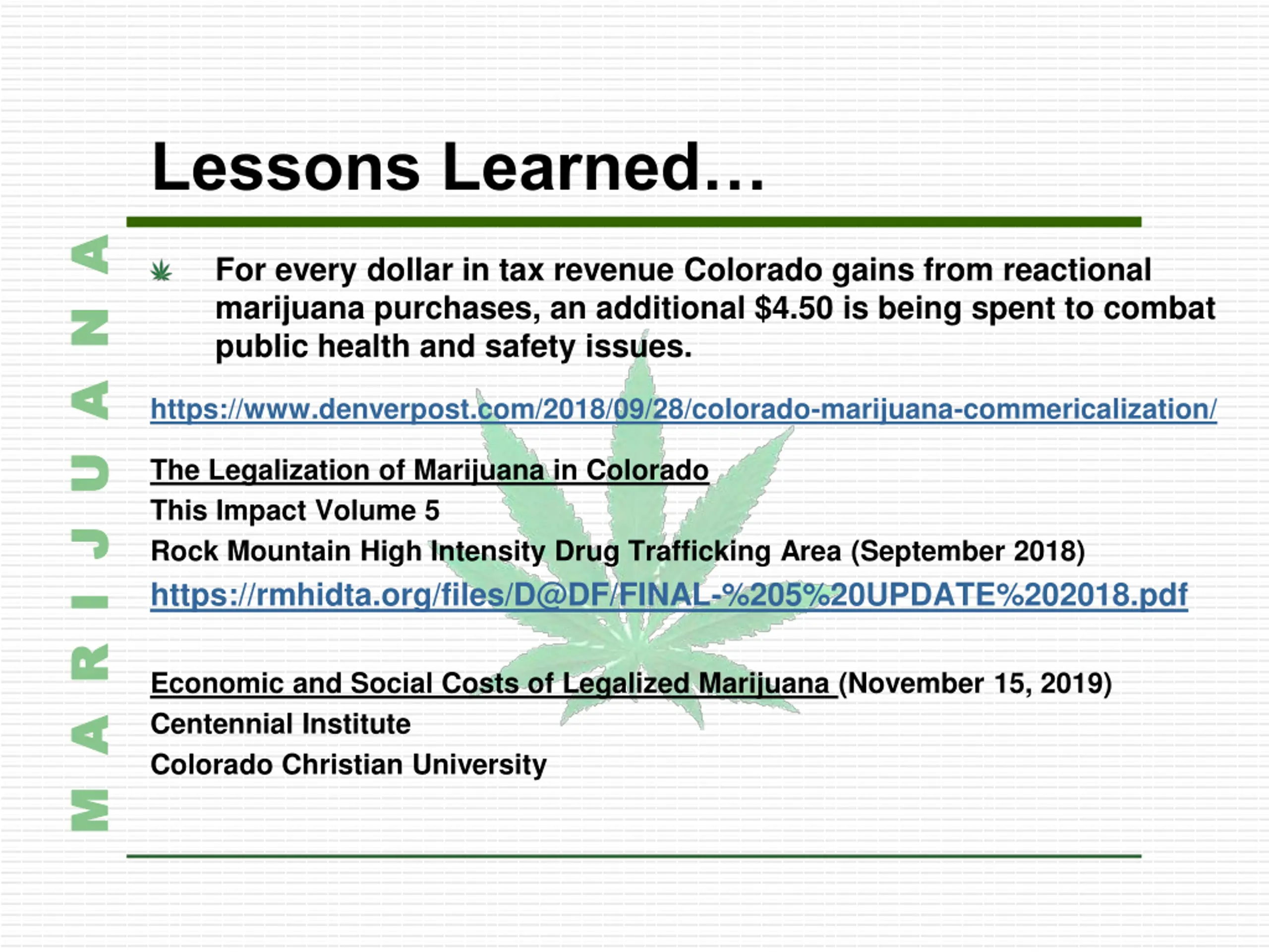 Lessons Learned M A R I J U A N A M A R I J U A N A For every dollar in tax revenue Colorado gains from reactional marijuana purchases, an additional $4.50 is being spent to combat public health and safety issues. https://www.denverpost.com/2018/09/28/colorado-marijuana-commericalization/ The Legalization of Marijuana in Colorado This Impact Volume 5 Rock Mountain High Intensity Drug Trafficking Area (September 2018) https://rmhidta.org/files/D@DF/FINAL-%205%20UPDATE%202018.pdf Economic and Social Costs of Legalized Marijuana (November 15, 2019) Centennial Institute Colorado Christian University