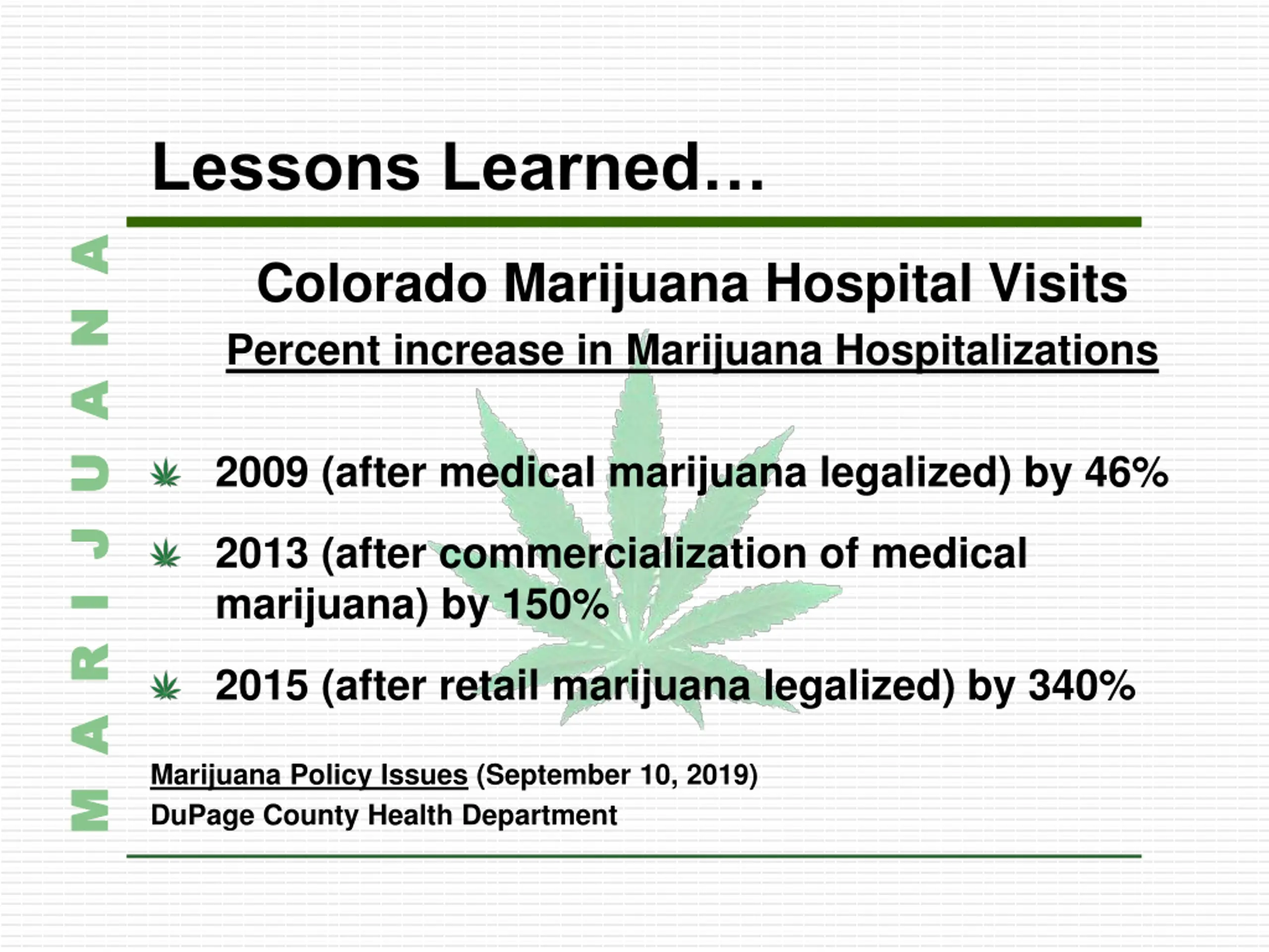 Lessons Learned M A R I J U A N A M A R I J U A N A Colorado Marijuana Hospital Visits Percent increase in Marijuana Hospitalizations 2009 (after medical marijuana legalized) by 46% 2013 (after commercialization of medical marijuana) by 150% 2015 (after retail marijuana legalized) by 340% Marijuana Policy Issues (September 10, 2019) DuPage County Health Department
