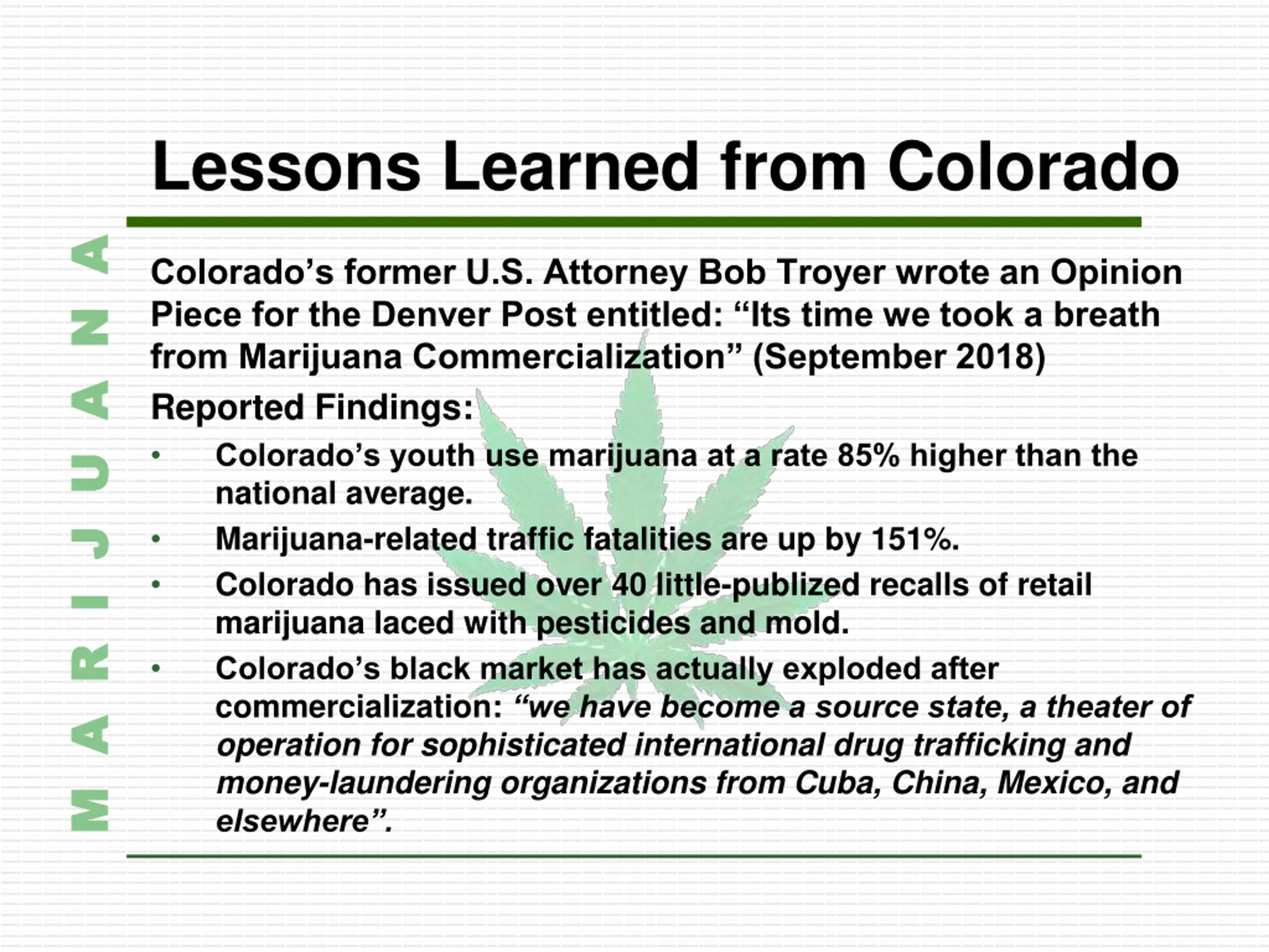 Lessons Learned from Colorado M A R I J U A N A M A R I J U A N A Colorado s former U.S. Attorney Bob Troyer wrote an Opinion Piece for the Denver Post entitled: Its time we took a breath from Marijuana Commercialization (September 2018) Reported Findings: Colorado s youth use marijuana at a rate 85% higher than the national average. Marijuana-related traffic fatalities are up by 151%. Colorado has issued over 40 little-publized recalls of retail marijuana laced with pesticides and mold. Colorado s black market has actually exploded after commercialization: we have become a source state, a theater of operation for sophisticated international drug trafficking and money-laundering organizations from Cuba, China, Mexico, and elsewhere .
