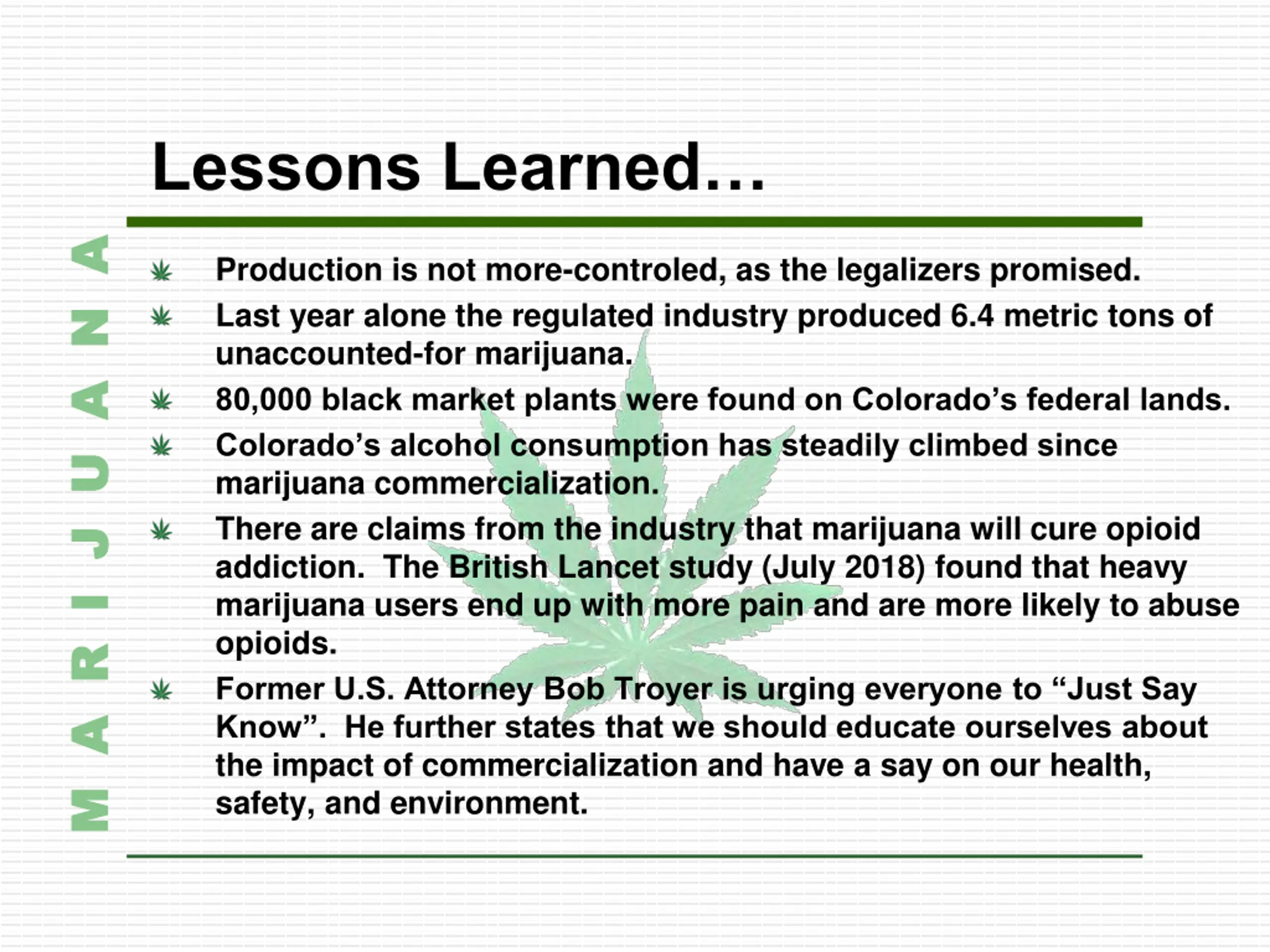 Lessons Learned M A R I J U A N A M A R I J U A N A Production is not more-controled, as the legalizers promised. Last year alone the regulated industry produced 6.4 metric tons of unaccounted-for marijuana. 80,000 black market plants were found on Colorado s federal lands. Colorado s alcohol consumption has steadily climbed since marijuana commercialization. There are claims from the industry that marijuana will cure opioid addiction. The British Lancet study (July 2018) found that heavy marijuana users end up with more pain and are more likely to abuse opioids. Former U.S. Attorney Bob Troyer is urging everyone to Just Say Know . He further states that we should educate ourselves about the impact of commercialization and have a say on our health, safety, and environment.