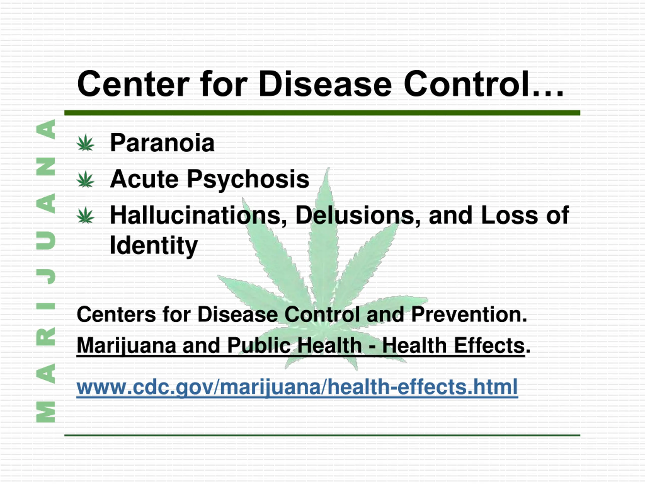 M A R I J U A N ACenter for Disease Control M A R I J U A N A Paranoia Acute Psychosis Hallucinations, Delusions, and Loss of Identity Centers for Disease Control and Prevention. Marijuana and Public Health - Health Effects. www.cdc.gov/marijuana/health-effects.html