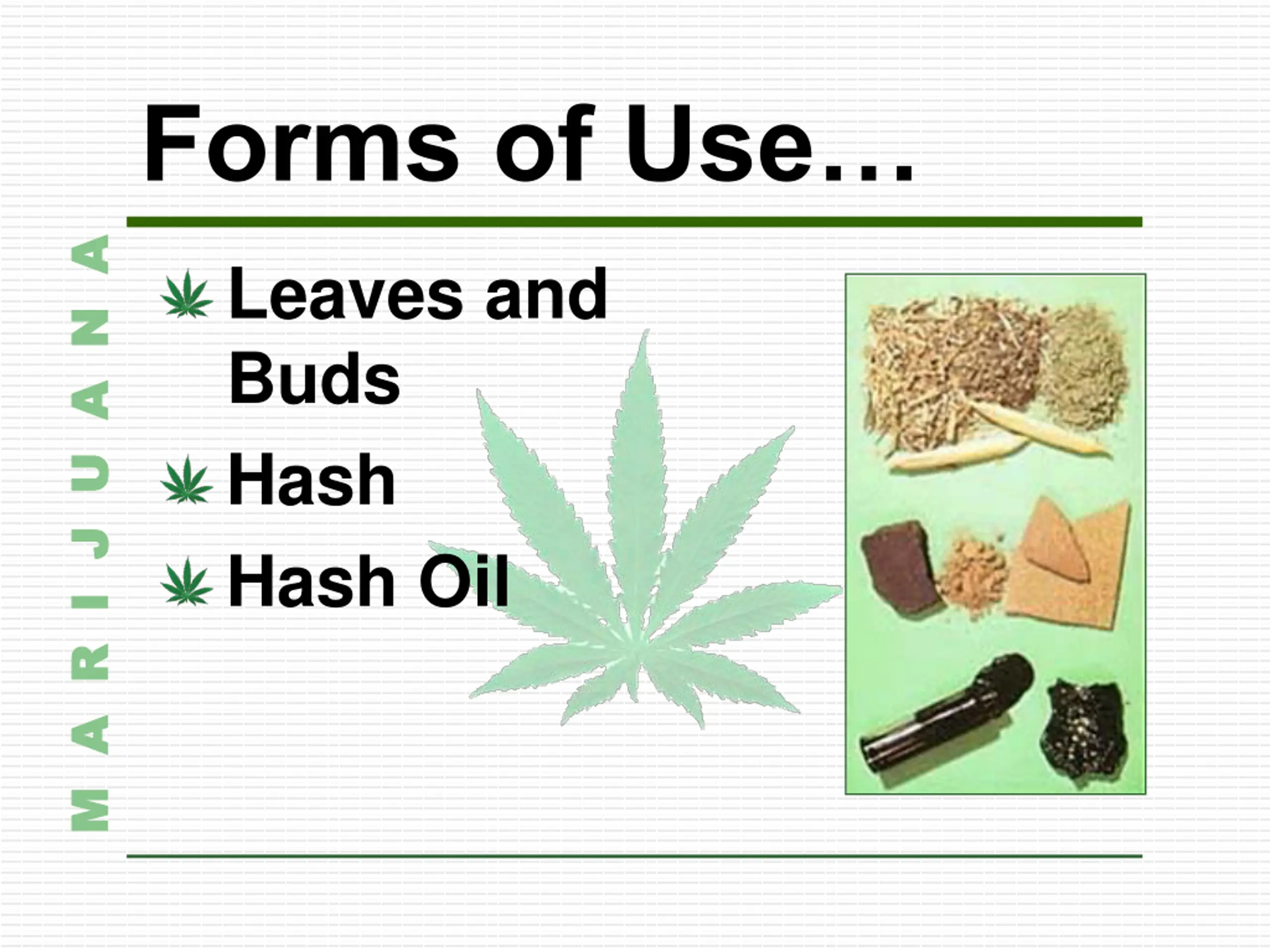 M A R I J U A N AForms of Use M A R I J U A N A Leaves and Buds Hash Hash Oil