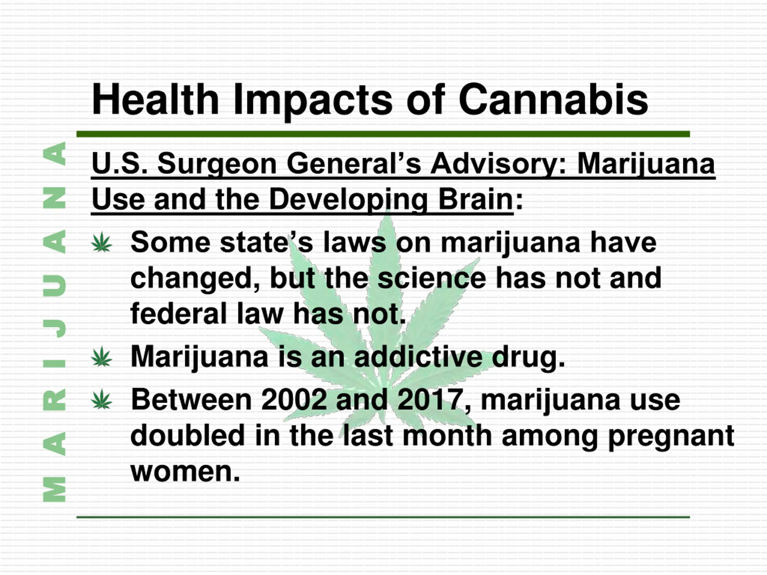 M A R I J U A N AHealth Impacts of Cannabis M A R I J U A N A U.S. Surgeon General s Advisory: Marijuana Use and the Developing Brain: Some state s laws on marijuana have changed, but the science has not and federal law has not. Marijuana is an addictive drug. Between 2002 and 2017, marijuana use doubled in the last month among pregnant women.