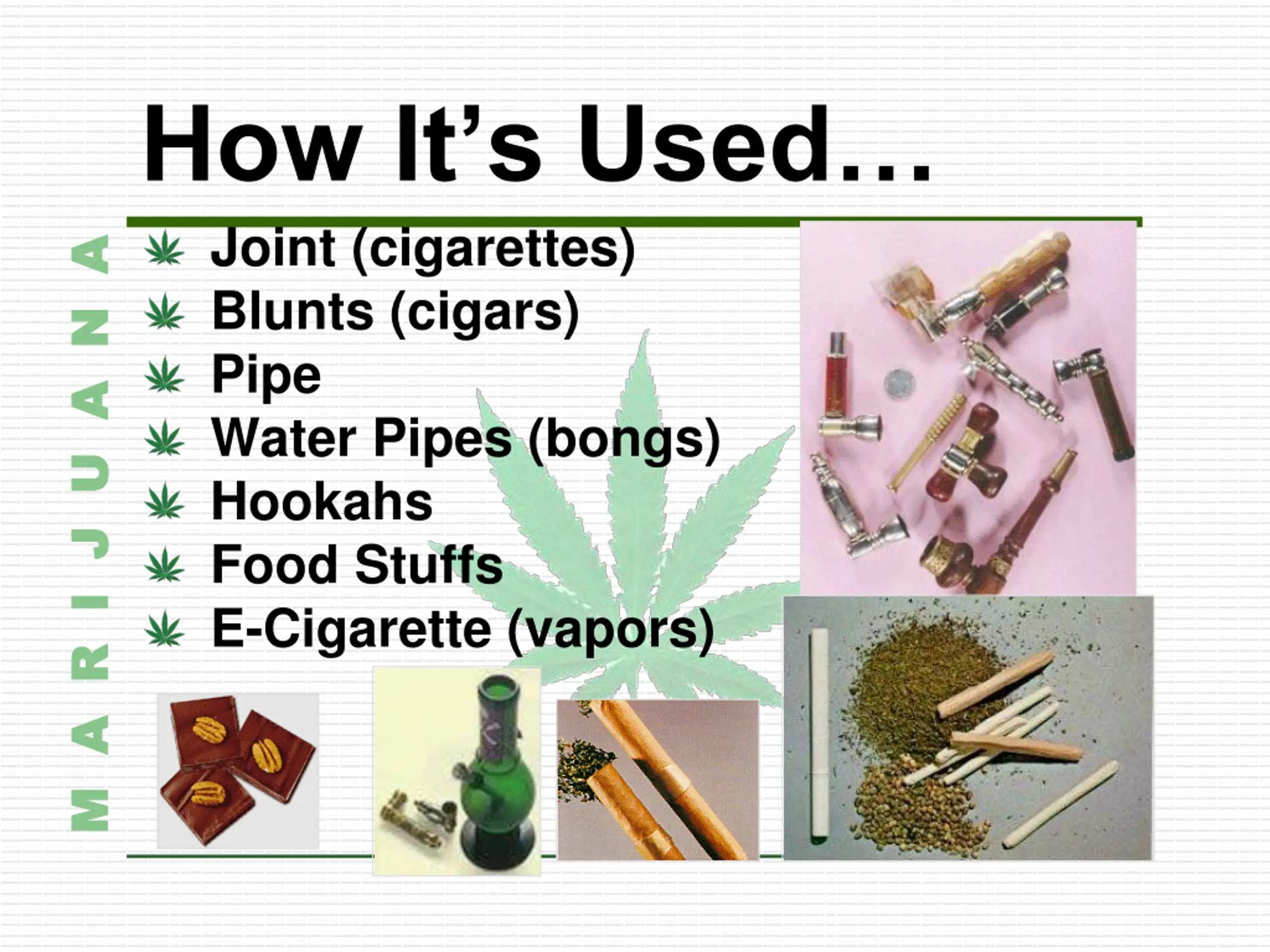 M A R I J U A N AHow Its Used Joint (cigarettes) Blunts (cigars) Pipe Water Pipes (bongs) Hookahs Food Stuffs E-Cigarette (vapors) M A R I J U A N A