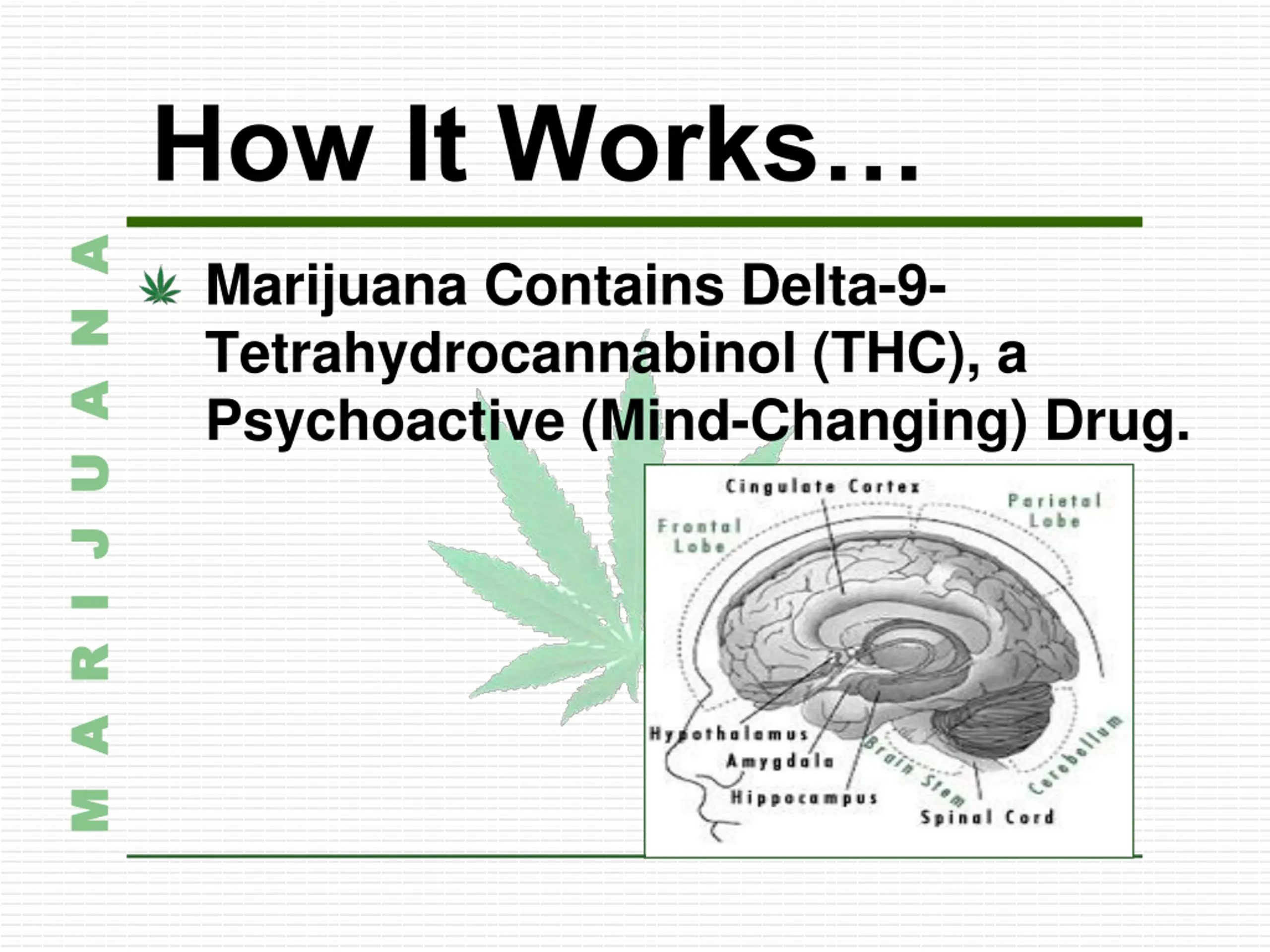 M A R I J U A N AHow It Works M A R I J U A N A Marijuana Contains Delta-9- Tetrahydrocannabinol (THC), a Psychoactive (Mind-Changing) Drug.