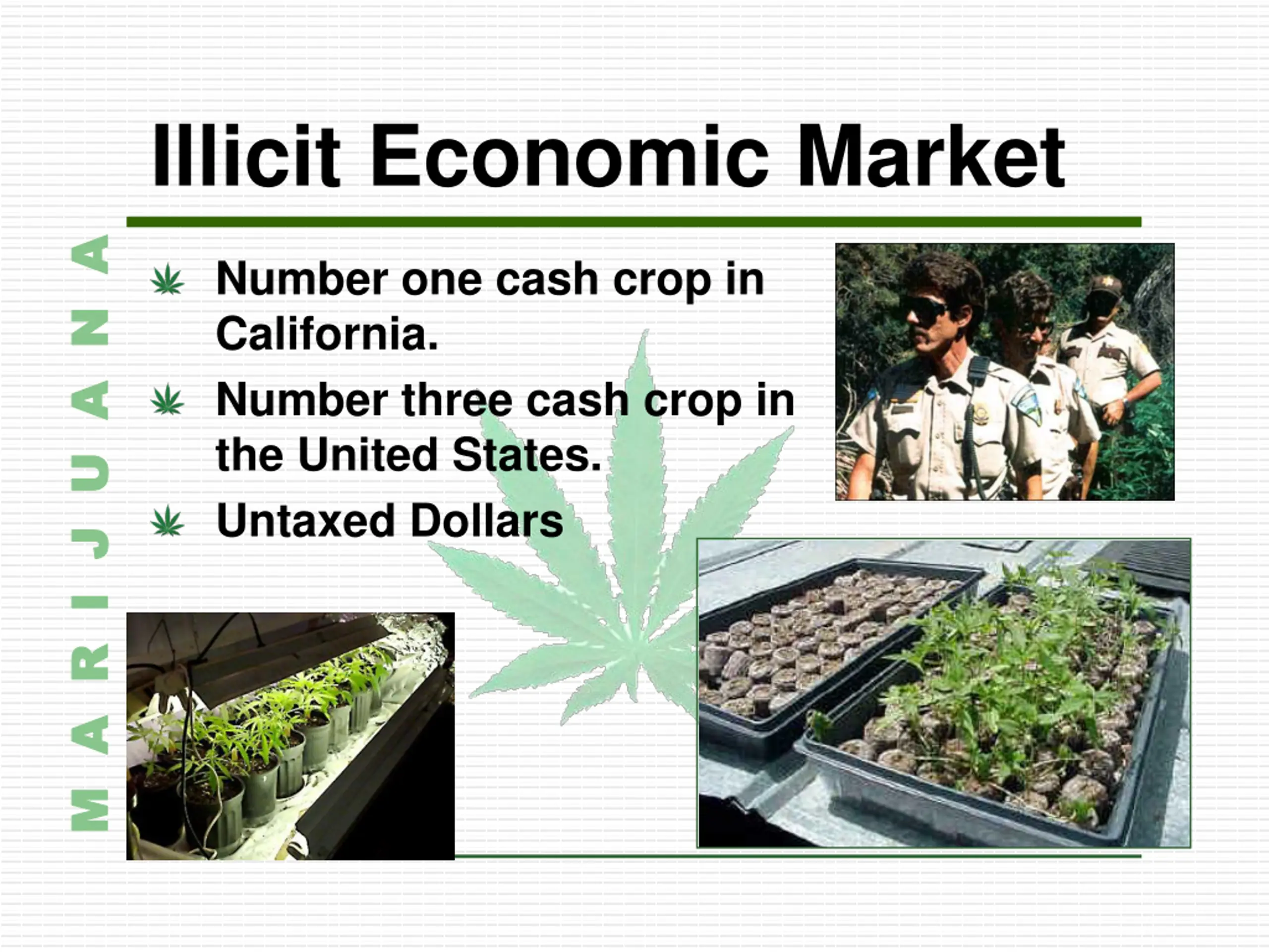 M A R I J U A N AIllicit Economic Market M A R I J U A N A Number one cash crop in California. Number three cash crop in the United States. Untaxed Dollars