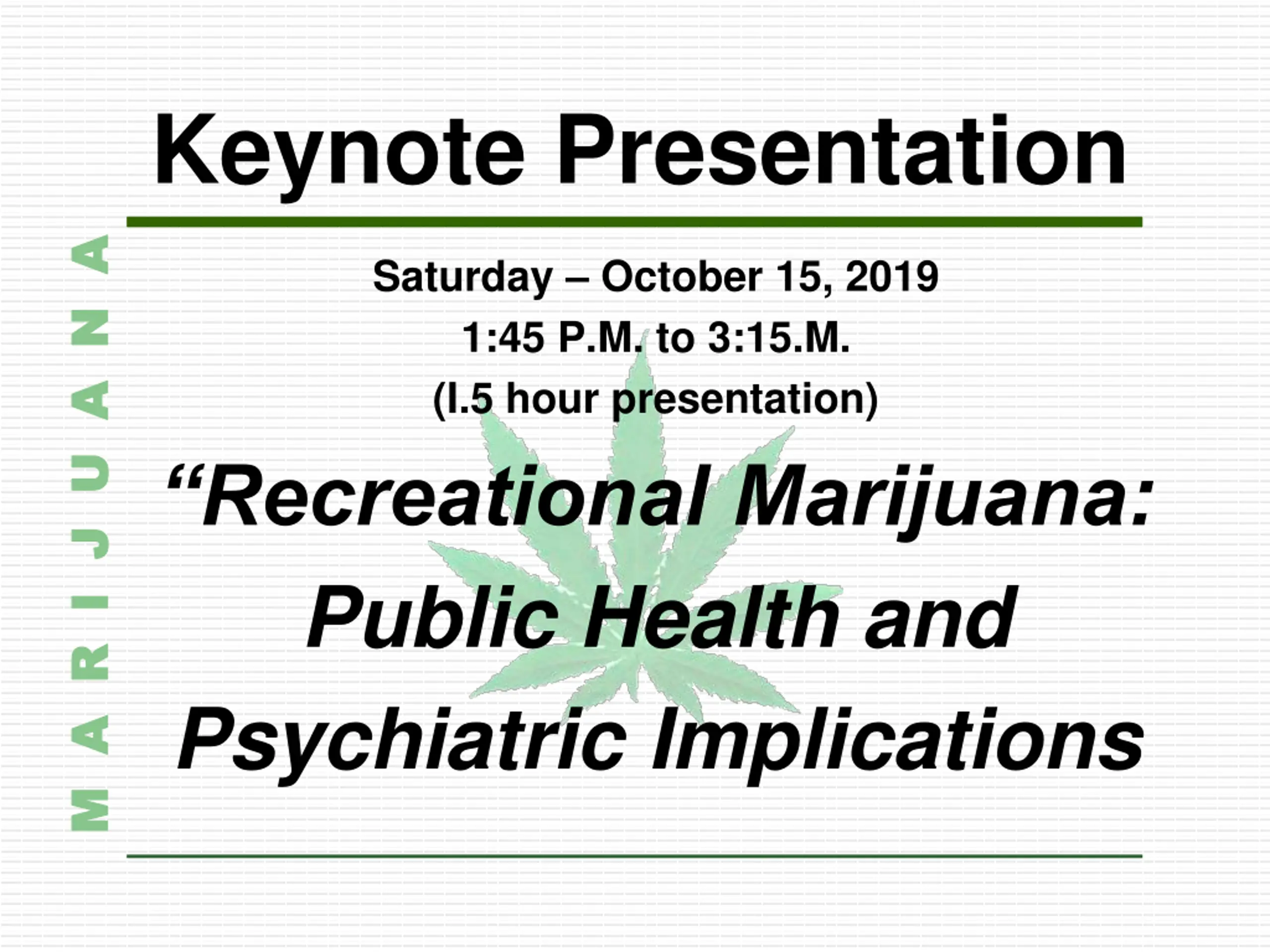 M A R I J U A N AKeynote Presentation M A R I J U A N A Saturday October 15, 2019 1:45 P.M. to 3:15.M. (I.5 hour presentation) Recreational Marijuana: Public Health and Psychiatric Implications