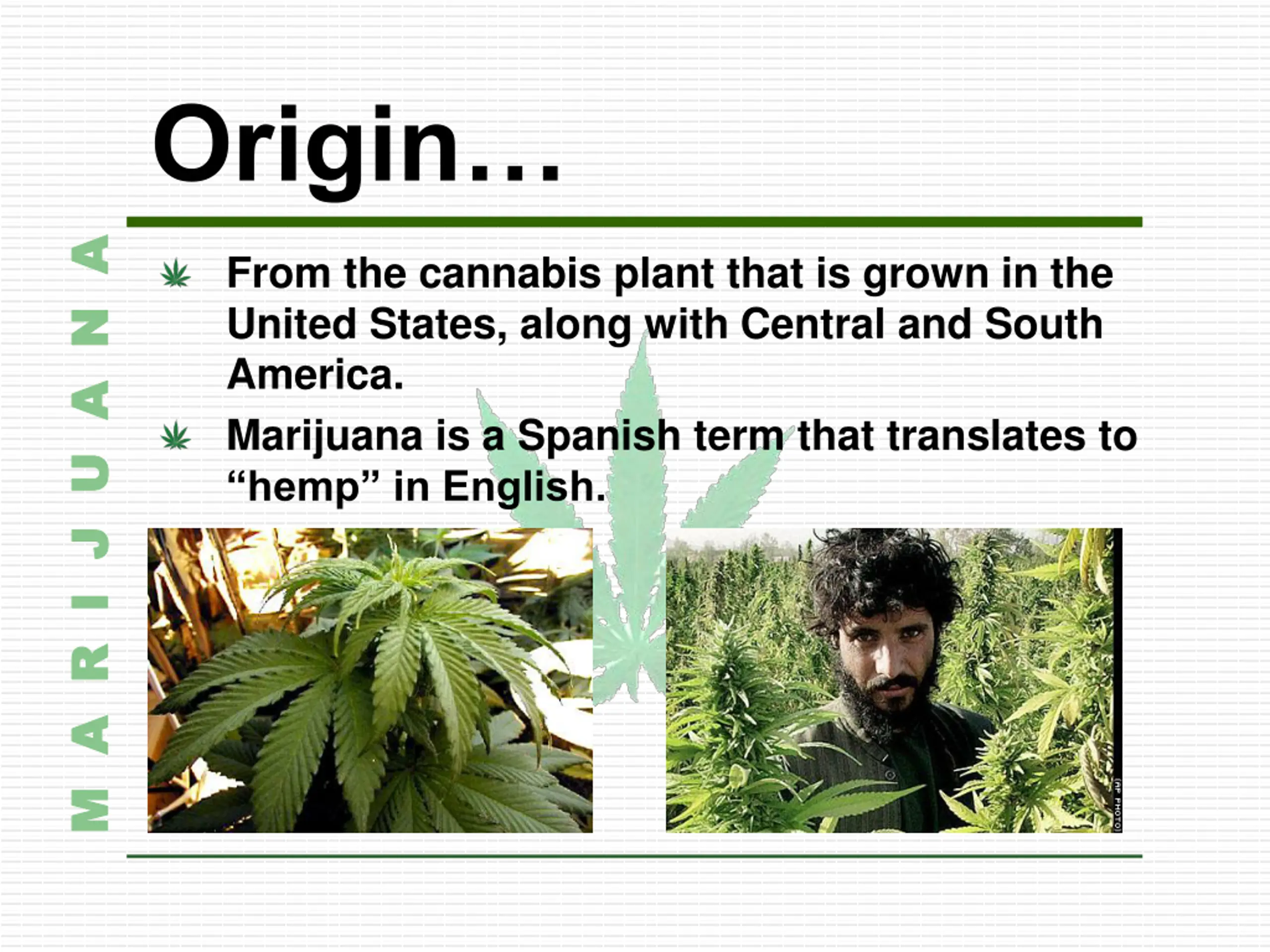 M A R I J U A N AOrigin M A R I J U A N A From the cannabis plant that is grown in the United States, along with Central and South America. Marijuana is a Spanish term that translates to hemp in English.