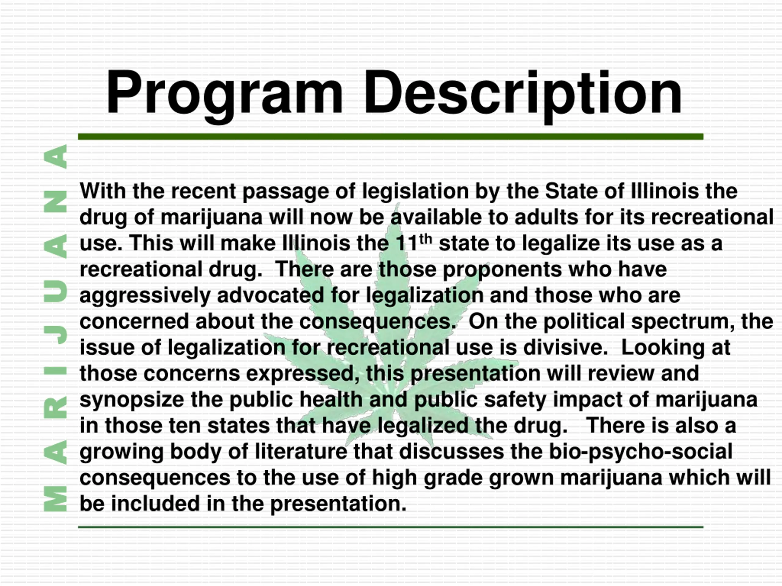 M A R I J U A N AProgram Description be included in the presentation. M A R I J U A N A With the recent passage of legislation by the State of Illinois the drug of marijuana will now be available to adults for its recreational use. This will make Illinois the 11thstate to legalize its use as a recreational drug. There are those proponents who have aggressively advocated for legalization and those who are concerned about the consequences. On the political spectrum, the issue of legalization for recreational use is divisive. Looking at those concerns expressed, this presentation will review and synopsize the public health and public safety impact of marijuana in those ten states that have legalized the drug. There is also a growing body of literature that discusses the bio-psycho-social consequences to the use of high grade grown marijuana which will