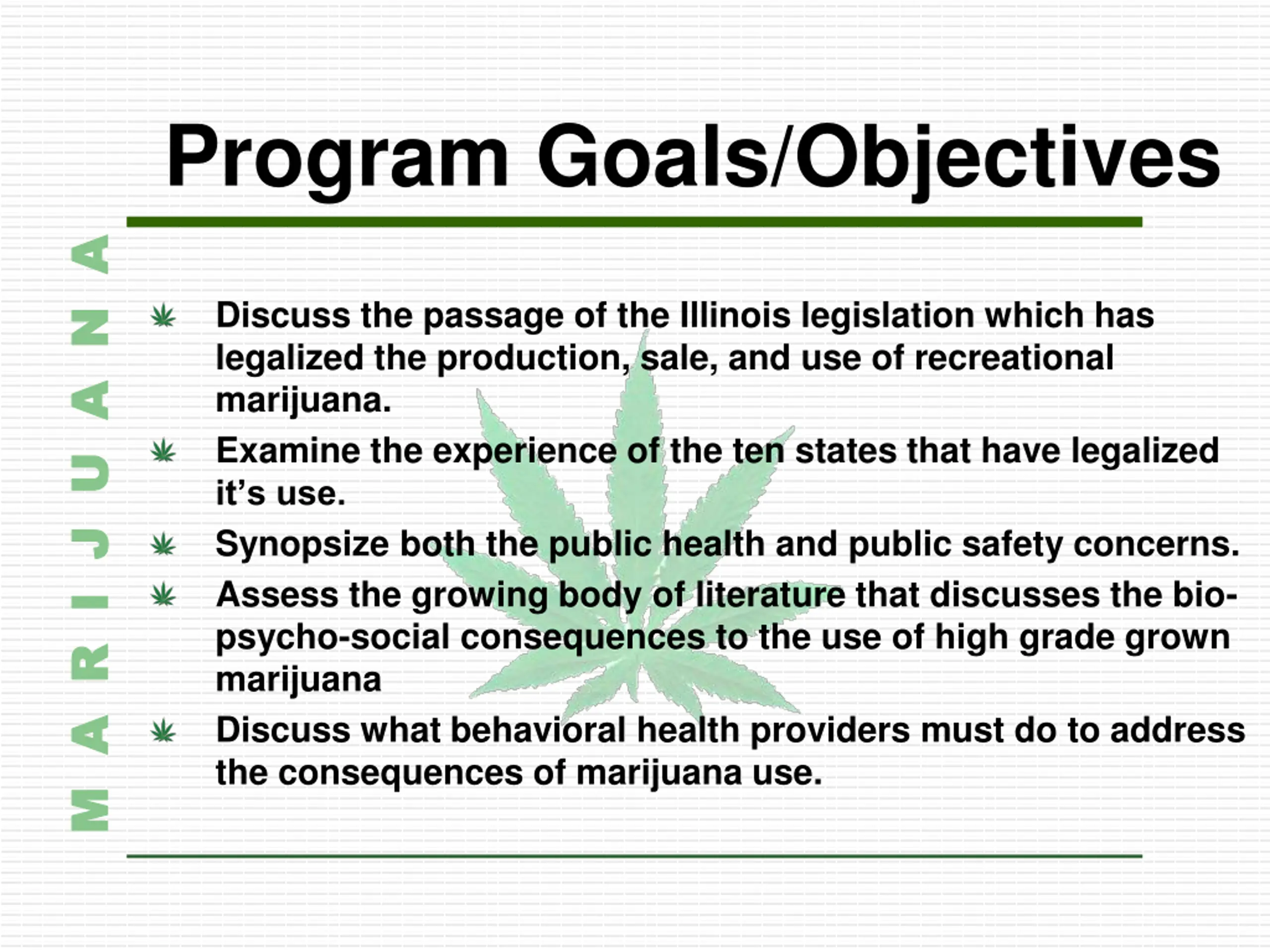 M A R I J U A N AProgram Goals/Objectives M A R I J U A N A Discuss the passage of the Illinois legislation which has legalized the production, sale, and use of recreational marijuana. Examine the experience of the ten states that have legalized it s use. Synopsize both the public health and public safety concerns. Assess the growing body of literature that discusses the bio- psycho-social consequences to the use of high grade grown marijuana Discuss what behavioral health providers must do to address the consequences of marijuana use.