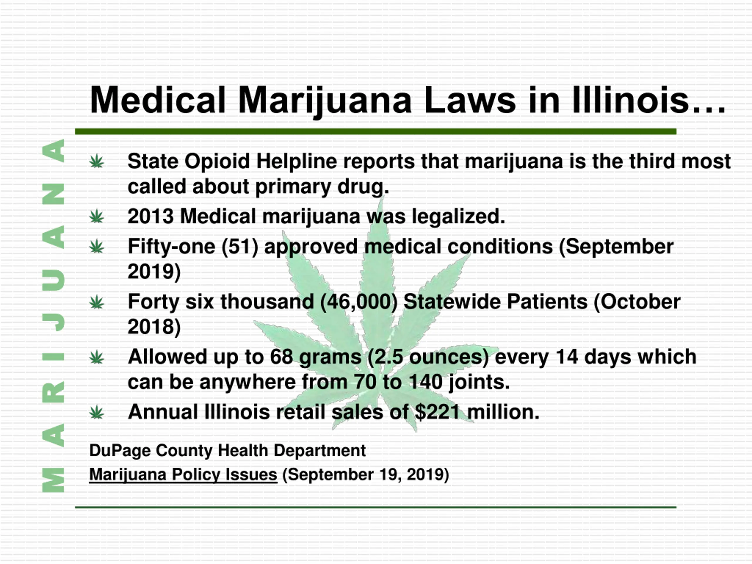 Medical Marijuana Laws in Illinois M A R I J U A N A M A R I J U A N A State Opioid Helpline reports that marijuana is the third most called about primary drug. 2013 Medical marijuana was legalized. Fifty-one (51) approved medical conditions (September 2019) Forty six thousand (46,000) Statewide Patients (October 2018) Allowed up to 68 grams (2.5 ounces) every 14 days which can be anywhere from 70 to 140 joints. Annual Illinois retail sales of $221 million. DuPage County Health Department Marijuana Policy Issues (September 19, 2019)