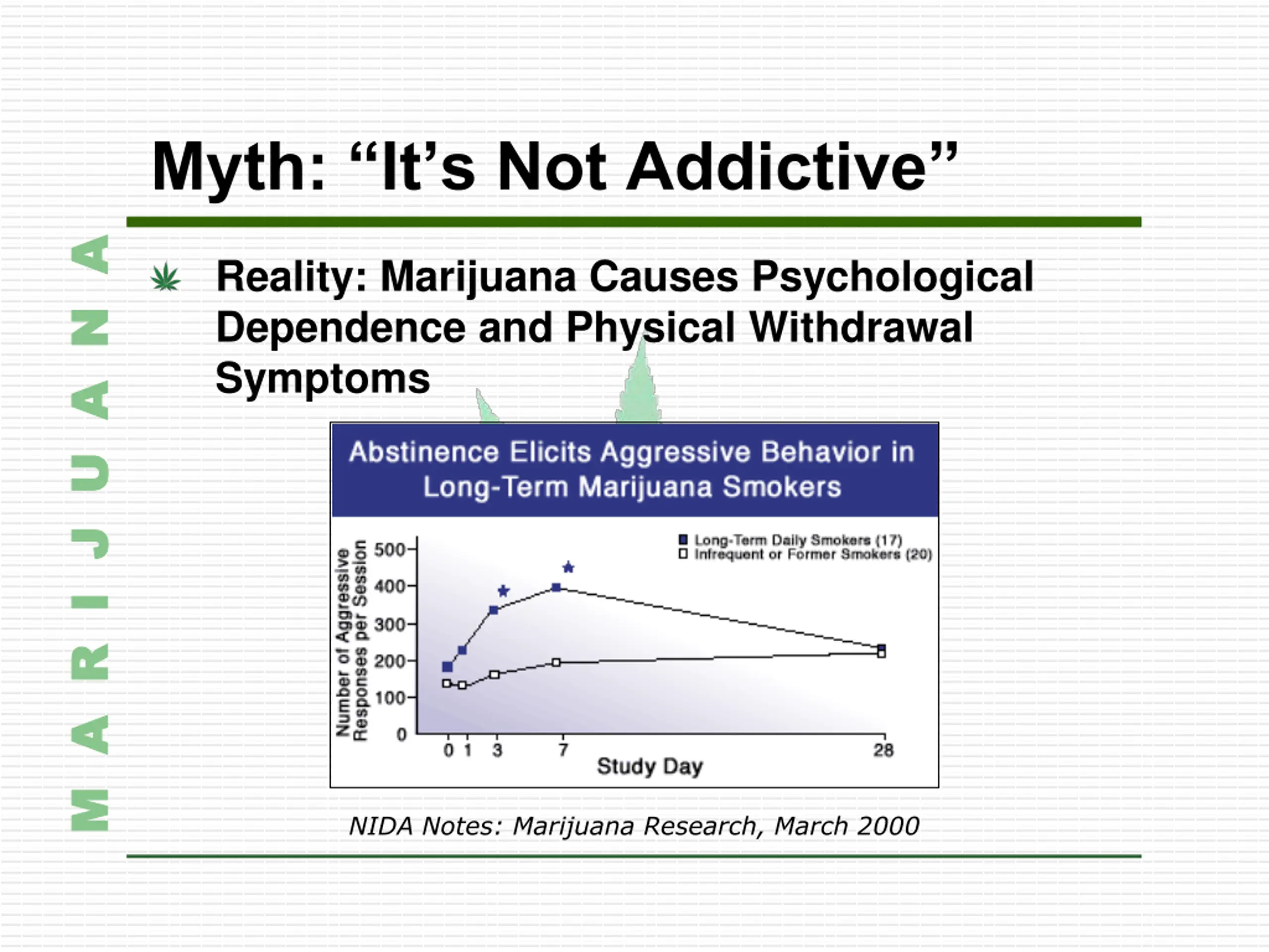 Myth: Its Not Addictive M A R I J U A N A M A R I J U A N A Reality: Marijuana Causes Psychological Dependence and Physical Withdrawal Symptoms NIDA Notes: Marijuana Research, March 2000