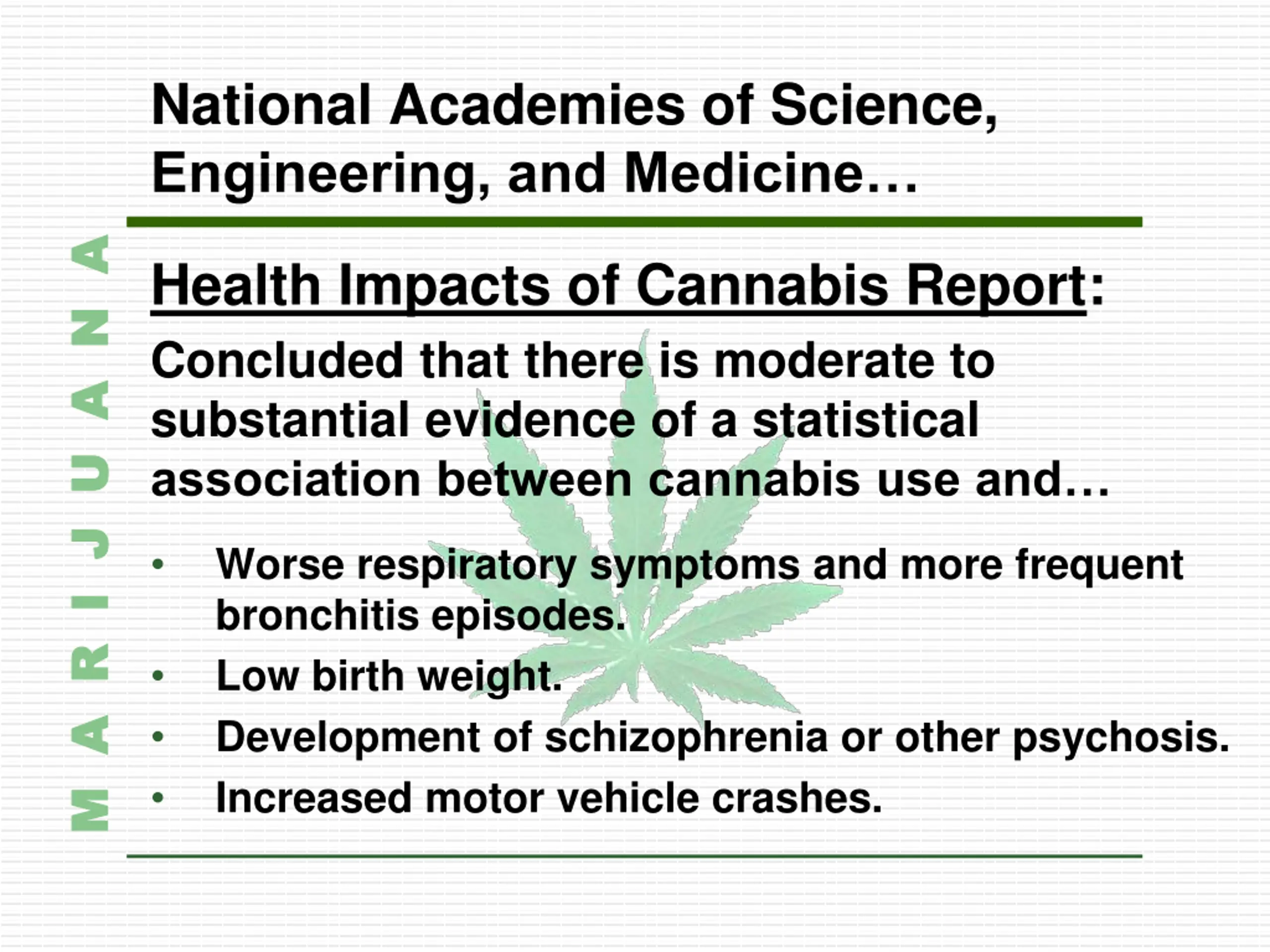 National Academies of Science, Engineering, and Medicine M A R I J U A N A M A R I J U A N A Health Impacts of Cannabis Report: Concluded that there is moderate to substantial evidence of a statistical association between cannabis use and Worse respiratory symptoms and more frequent bronchitis episodes. Low birth weight. Development of schizophrenia or other psychosis. Increased motor vehicle crashes.