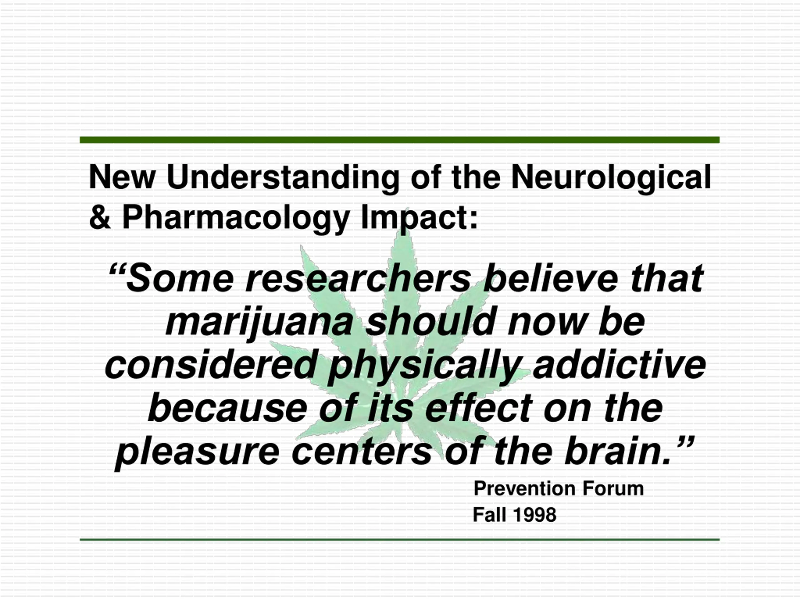 New Understanding of the Neurological & Pharmacology Impact: Some researchers believe that marijuana should now be considered physically addictive because of its effect on the pleasure centers of the brain. Prevention Forum Fall 1998