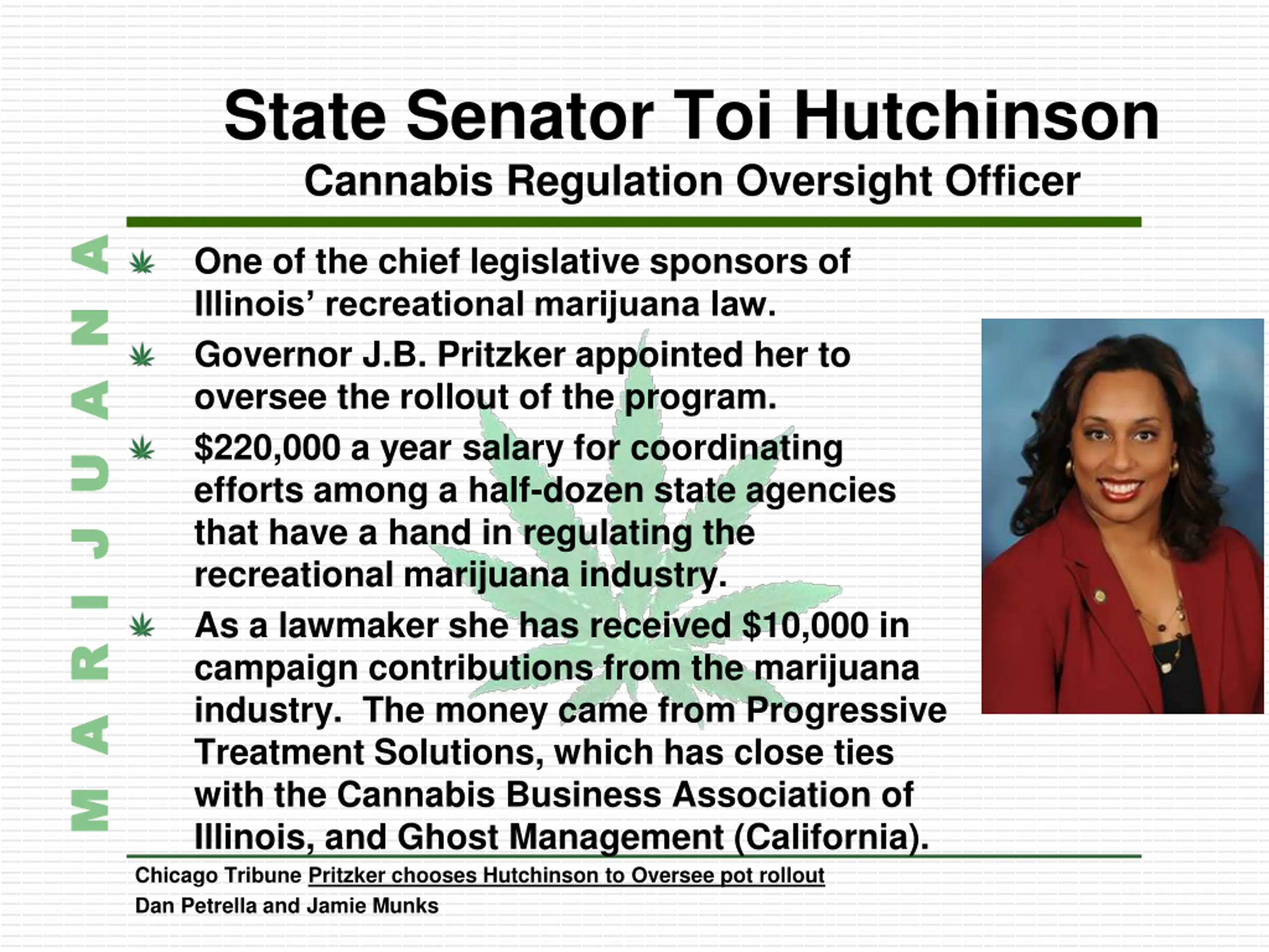 State Senator Toi Hutchinson Cannabis Regulation Oversight Officer M A R I J U A N A M A R I J U A N A One of the chief legislative sponsors of Illinois recreational marijuana law. Governor J.B. Pritzker appointed her to oversee the rollout of the program. $220,000 a year salary for coordinating efforts among a half-dozen state agencies that have a hand in regulating the recreational marijuana industry. As a lawmaker she has received $10,000 in campaign contributions from the marijuana industry. The money came from Progressive Treatment Solutions, which has close ties with the Cannabis Business Association of Illinois, and Ghost Management (California). Chicago Tribune Pritzker chooses Hutchinson to Oversee pot rollout Dan Petrella and Jamie Munks